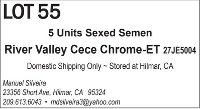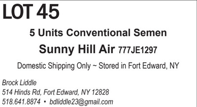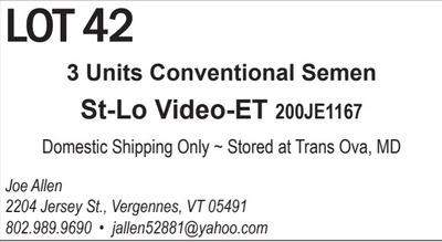-Selling price is per Embryo or straw of semen Lots will be Sold with Reserves -Buyer is responsible for all costs of shipping expenses. This auction will utilize an auto-extend, race horse style soft closing. With this feature, the bidding will close on ALL lots at the same time. Bidding will start to close at 7:00 pm EST if any lot receives a bid in the last minute of bidding, ALL LOTS will extend bidding for an additional (ONE) 1 minute. Once 1 minute has lapsed without any bidding activity, then ALL lots will close.