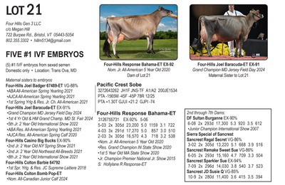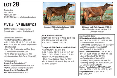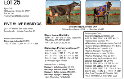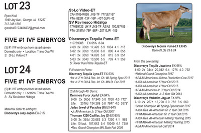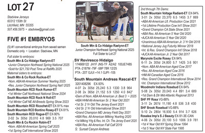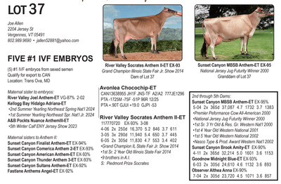 -Selling price is per Embryo or straw of semen Lots will be Sold with Reserves -Buyer is responsible for all costs of shipping expenses. This auction will utilize an auto-extend, race horse style soft closing. With this feature, the bidding will close on ALL lots at the same time. Bidding will start to close at 7:00 pm EST if any lot receives a bid in the last minute of bidding, ALL LOTS will extend bidding for an additional (ONE) 1 minute. Once 1 minute has lapsed without any bidding activity, then ALL lots will close.