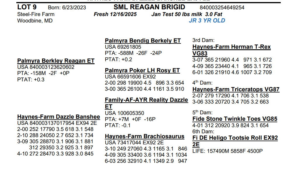 Born: 6/23/2023 Fresh 12/16/2025 Jan Test 50 lbs milk 3.0 Fat