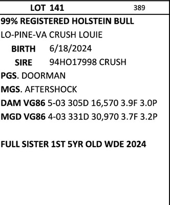 BREED:  HOL INFO:  HENRY STOLTZFUS HERD DAM SELLS AS LOT 30 REPRO:  MILK CALF SIRE:   DOB: 11/26/25