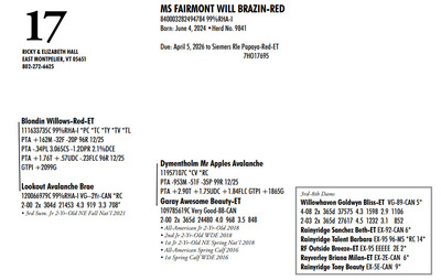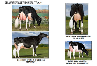 DVC GREEN & GOLD SPRING SPECTACULAR 108 Farm View Road, Doylestown PA, 18901 21st Anniversary Edition Contact Agent: Aaron Ray Tompkins 336-363-4639 Catalog | Terms of Auction Download CATALOG Download SALE ORDER Download UPDATES Download UPDATED LOTS Download UPDATED LOTS Catalog | Terms Download CATALOG Download SALE ORDER Download UPDATES Download UPDATED LOTS Download UPDATED LOTS All Items (95) Cattle (84) Embryos (11) Categories All Items (95) Cattle (84) Embryos (11) Search Item #: Keyword: Search Catalog Item #: Keyword: 20 items per page 50 items per page 100 items per page Go to page #: 1 , 2 , 3 , 4 , 5 #1 – MS ROMPEN MISCHIEF-RED-ET 840003281746339 99%RHA-I VG-85 86-MS @ 2-03 Born: December 5, 2023 32K GTPI +2300G A1/A2 Fresh: November 19, 2025 Due: November 16, 2026 to Farnear Audacious-Red 551HO6078 Location: 108 Farm View Road, Doylestown PA, 18901 Contact Agent: Aaron Ray Tompkins 336-363-4639 More Info / Bid Now Track this Item Sold High Bid: $8,400.00 – #147 #1 – MS ROMPEN MISCHIEF-RED-ET Sold High Bid: $8,400 More Details More Info / Bid Track Item 840003281746339 99%RHA-I VG-85 86-MS @ 2-03 Born: December 5, 2023 32K GTPI +2300G A1/A2 Fresh: November 19, 2025 Due: November 16, 2026 to Farnear Audacious-Red 551HO6078 Location: 108 Farm View Road, Doylestown PA, 18901 Contact Agent: Aaron Ray Tompkins 336-363-4639 #1D – DAX X APPLE THREE-#1 IVF FEMALE EMBRYOS PROCEEDS GO TO DVU DAIRY SOCIETY Location: 108 Farm View Road, Doylestown PA, 18901 Contact Agent: Aaron Ray Tompkins 336-363-4639 More Info / Bid Now Track this Item Sold High Bid: $350.00 – #1104 Auction Type: Quantity x Price Quantity: 3 #1D – DAX X APPLE Quantity x PriceQuantity: 3 Sold High Bid: $350 More Details More Info / Bid Track Item THREE-#1 IVF FEMALE EMBRYOS PROCEEDS GO TO DVU DAIRY SOCIETY Location: 108 Farm View Road, Doylestown PA, 18901 Contact Agent: Aaron Ray Tompkins 336-363-4639 #2 – MIDDLEBUSH PALDWYN MAPLE-RED 840003311730844 99%RHA-I *TC *TV *TL Born: November 19, 2025 Herd No. 521 A1/A2 Location: 108 Farm View Road, Doylestown PA, 18901 Contact Agent: Aaron Ray Tompkins 336-363-4639 More Info / Bid Now Track this Item Sold High Bid: $2,300.00 – #124 #2 – MIDDLEBUSH PALDWYN MAPLE-RED Sold High Bid: $2,300 More Details More Info / Bid Track Item 840003311730844 99%RHA-I *TC *TV *TL Born: November 19, 2025 Herd No. 521 A1/A2 Location: 108 Farm View Road, Doylestown PA, 18901 Contact Agent: Aaron Ray Tompkins 336-363-4639 #3 – PLEASANT NOOK ALL LILAC-ET 840003298864621 Born: December 5, 2025 Location: 108 Farm View Road, Doylestown PA, 18901 Contact Agent: Aaron Ray Tompkins 336-363-4639 More Info / Bid Now Track this Item Sold High Bid: $2,700.00 – #1067 #3 – PLEASANT NOOK ALL LILAC-ET Sold High Bid: $2,700 More Details More Info / Bid Track Item 840003298864621 Born: December 5, 2025 Location: 108 Farm View Road, Doylestown PA, 18901 Contact Agent: Aaron Ray Tompkins 336-363-4639 #4 – PEACE&PLENTY CARTEL JUBCART 145858579 99%RHA-I Born: September 16, 2025 Herd No. 2424 Location: 108 Farm View Road, Doylestown PA, 18901 Contact Agent: Aaron Ray Tompkins 336-363-4639 More Info / Bid Now Track this Item Sold High Bid: $3,100.00 – #16 #4 – PEACE&PLENTY CARTEL JUBCART Sold High Bid: $3,100 More Details More Info / Bid Track Item 145858579 99%RHA-I Born: September 16, 2025 Herd No. 2424 Location: 108 Farm View Road, Doylestown PA, 18901 Contact Agent: Aaron Ray Tompkins 336-363-4639 #5 – PEACESTONE LAM ABSOLUTE-ET 840003296764331 99%RHA-I Born: September 6, 2025 Herd No. 65 Location: 108 Farm View Road, Doylestown PA, 18901 Contact Agent: Aaron Ray Tompkins 336-363-4639 More Info / Bid Now Track this Item Sold High Bid: $3,400.00 – #149 #5 – PEACESTONE LAM ABSOLUTE-ET Sold High Bid: $3,400 More Details More Info / Bid Track Item 840003296764331 99%RHA-I Born: September 6, 2025 Herd No. 65 Location: 108 Farm View Road, Doylestown PA, 18901 Contact Agent: Aaron Ray Tompkins 336-363-4639 #6 – MS LAMBDA SILK-ET Registration Pending Born: March 18, 2024 Fresh: February 9, 2026 Location: 108 Farm View Road, Doylestown PA, 18901 Contact Agent: Aaron Ray Tompkins 336-363-4639 More Info / Bid Now Track this Item Sold High Bid: $11,700.00 – #147 #6 – MS LAMBDA SILK-ET Sold High Bid: $11,700 More Details More Info / Bid Track Item Registration Pending Born: March 18, 2024 Fresh: February 9, 2026 Location: 108 Farm View Road, Doylestown PA, 18901 Contact Agent: Aaron Ray Tompkins 336-363-4639 #7 – GVA DROPBOX CHATA-ET 840003295288401 Pending Born: June 8, 2025 Herd No. 3620 Location: 108 Farm View Road, Doylestown PA, 18901 Contact Agent: Aaron Ray Tompkins 336-363-4639 More Info / Bid Now Track this Item Sold High Bid: $5,000.00 – #1060 #7 – GVA DROPBOX CHATA-ET Sold High Bid: $5,000 More Details More Info / Bid Track Item 840003295288401 Pending Born: June 8, 2025 Herd No. 3620 Location: 108 Farm View Road, Doylestown PA, 18901 Contact Agent: Aaron Ray Tompkins 336-363-4639 #8 – OAKFIELD SUPERMAN TURTLE-ET 840003286536402 99%RHA-I Born: September 3, 2025 Herd 7781 55K GTPI +2457G +2.75T +1.63UDC +1.64FLC Location: 108 Farm View Road, Doylestown PA, 18901 Contact Agent: Aaron Ray Tompkins 336-363-4639 More Info / Bid Now Track this Item Sold High Bid: $2,600.00 – #1060 #8 – OAKFIELD SUPERMAN TURTLE-ET Sold High Bid: $2,600 More Details More Info / Bid Track Item 840003286536402 99%RHA-I Born: September 3, 2025 Herd 7781 55K GTPI +2457G +2.75T +1.63UDC +1.64FLC Location: 108 Farm View Road, Doylestown PA, 18901 Contact Agent: Aaron Ray Tompkins 336-363-4639 #9 – HEIFER CALF Registration Pending Born: March 11, 2026 Location: 108 Farm View Road, Doylestown PA, 18901 Contact Agent: Aaron Ray Tompkins 336-363-4639 More Info / Bid Now Track this Item Sold High Bid: $2,200.00 – #1057 #9 – HEIFER CALF Sold High Bid: $2,200 More Details More Info / Bid Track Item Registration Pending Born: March 11, 2026 Location: 108 Farm View Road, Doylestown PA, 18901 Co