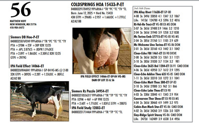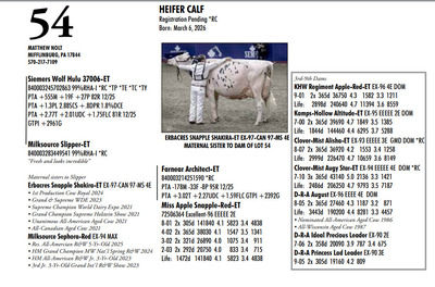 DVC GREEN & GOLD SPRING SPECTACULAR 108 Farm View Road, Doylestown PA, 18901 21st Anniversary Edition Contact Agent: Aaron Ray Tompkins 336-363-4639 Catalog | Terms of Auction Download CATALOG Download SALE ORDER Download UPDATES Download UPDATED LOTS Download UPDATED LOTS Catalog | Terms Download CATALOG Download SALE ORDER Download UPDATES Download UPDATED LOTS Download UPDATED LOTS All Items (95) Cattle (84) Embryos (11) Categories All Items (95) Cattle (84) Embryos (11) Search Item #: Keyword: Search Catalog Item #: Keyword: 20 items per page 50 items per page 100 items per page Go to page #: 1 , 2 , 3 , 4 , 5 #40 – ZBW-JLP ARCTCT JIANT-RED-ET 840003266250341 99%RHA-I Born: June 3, 2024 Herd No. 1562 Due: September 17, 2026 to Rager-Red or Hollandview InLight Of-Red (Herd Bull) Location: 108 Farm View Road, Doylestown PA, 18901 Contact Agent: Aaron Ray Tompkins 336-363-4639 More Info / Bid Now Track this Item Sold High Bid: $3,500.00 – #119 #40 – ZBW-JLP ARCTCT JIANT-RED-ET Sold High Bid: $3,500 More Details More Info / Bid Track Item 840003266250341 99%RHA-I Born: June 3, 2024 Herd No. 1562 Due: September 17, 2026 to Rager-Red or Hollandview InLight Of-Red (Herd Bull) Location: 108 Farm View Road, Doylestown PA, 18901 Contact Agent: Aaron Ray Tompkins 336-363-4639 #41 – DARKHORSE ALPHA ESCALTOR-ET 840003284049748 99%RHA-I *RC *TC *TL Born: September 2, 2024 Herd No. 744 43K GTPI +2160G A1/A1 AE Due: September 20, 2026 to Angus Location: 108 Farm View Road, Doylestown PA, 18901 Contact Agent: Aaron Ray Tompkins 336-363-4639 More Info / Bid Now Track this Item Sold High Bid: $3,400.00 – #126 #41 – DARKHORSE ALPHA ESCALTOR-ET Sold High Bid: $3,400 More Details More Info / Bid Track Item 840003284049748 99%RHA-I *RC *TC *TL Born: September 2, 2024 Herd No. 744 43K GTPI +2160G A1/A1 AE Due: September 20, 2026 to Angus Location: 108 Farm View Road, Doylestown PA, 18901 Contact Agent: Aaron Ray Tompkins 336-363-4639 #42 – OAKFIELD HULU SIRI-RED 840003300022576 99%RHA-I Born: June 1, 2025 Herd No. 8245 55K GTPI +2303G +2.23T +1.04UDC +1.02FLC A1/A2 BE Location: 108 Farm View Road, Doylestown PA, 18901 Contact Agent: Aaron Ray Tompkins 336-363-4639 More Info / Bid Now Track this Item Sold High Bid: $2,800.00 – #156 #42 – OAKFIELD HULU SIRI-RED Sold High Bid: $2,800 More Details More Info / Bid Track Item 840003300022576 99%RHA-I Born: June 1, 2025 Herd No. 8245 55K GTPI +2303G +2.23T +1.04UDC +1.02FLC A1/A2 BE Location: 108 Farm View Road, Doylestown PA, 18901 Contact Agent: Aaron Ray Tompkins 336-363-4639 #43 – OAKFIELD HEAT SNOOPY-RED-ET 840003300022596 99%RHA-I *TE *TC *TY *TV *TL Born: June 20, 2025 Herd No. 8265 55K GTPI +2294G +2.22T +.83UDC +.64FLC A1/A2 AB Location: 108 Farm View Road, Doylestown PA, 18901 Contact Agent: Aaron Ray Tompkins 336-363-4639 More Info / Bid Now Track this Item Sold High Bid: $2,800.00 – #1060 #43 – OAKFIELD HEAT SNOOPY-RED-ET Sold High Bid: $2,800 More Details More Info / Bid Track Item 840003300022596 99%RHA-I *TE *TC *TY *TV *TL Born: June 20, 2025 Herd No. 8265 55K GTPI +2294G +2.22T +.83UDC +.64FLC A1/A2 AB Location: 108 Farm View Road, Doylestown PA, 18901 Contact Agent: Aaron Ray Tompkins 336-363-4639 #44 – OAKFIELD HULU SAMAYAH-ET 840003300022679 99%RHA-I *RC Born: September 3, 2025 Herd No. 8348 55K GTPI +2363G +1.90T +.99UDC +1.17FLC Location: 108 Farm View Road, Doylestown PA, 18901 Contact Agent: Aaron Ray Tompkins 336-363-4639 More Info / Bid Now Track this Item Sold High Bid: $2,800.00 – #1047 #44 – OAKFIELD HULU SAMAYAH-ET Sold High Bid: $2,800 More Details More Info / Bid Track Item 840003300022679 99%RHA-I *RC Born: September 3, 2025 Herd No. 8348 55K GTPI +2363G +1.90T +.99UDC +1.17FLC Location: 108 Farm View Road, Doylestown PA, 18901 Contact Agent: Aaron Ray Tompkins 336-363-4639 #45 – JOBO EYECANDY LARIAT-ET 840003296619943 Born: September 12, 2025 Herd No. 12954 GTPI +2384 +1.57 A1/A2 Location: 108 Farm View Road, Doylestown PA, 18901 Contact Agent: Aaron Ray Tompkins 336-363-4639 More Info / Bid Now Track this Item Sold High Bid: $2,600.00 – #1059 #45 – JOBO EYECANDY LARIAT-ET Sold High Bid: $2,600 More Details More Info / Bid Track Item 840003296619943 Born: September 12, 2025 Herd No. 12954 GTPI +2384 +1.57 A1/A2 Location: 108 Farm View Road, Doylestown PA, 18901 Contact Agent: Aaron Ray Tompkins 336-363-4639 #46 – FAIRMONT-RE ALPHA FLASHY 840003296152601 99%RHA-I *RC Born: June 6, 2025 Herd No. 825 Location: 108 Farm View Road, Doylestown PA, 18901 Contact Agent: Aaron Ray Tompkins 336-363-4639 More Info / Bid Now Track this Item Sold High Bid: $2,600.00 – #108 #46 – FAIRMONT-RE ALPHA FLASHY Sold High Bid: $2,600 More Details More Info / Bid Track Item 840003296152601 99%RHA-I *RC Born: June 6, 2025 Herd No. 825 Location: 108 Farm View Road, Doylestown PA, 18901 Contact Agent: Aaron Ray Tompkins 336-363-4639 #47 – FAIRMONT HULU FUEGO-RED 840003296152460 99%RHA-I Born: March 14, 2025 Herd No. 684 Location: 108 Farm View Road, Doylestown PA, 18901 Contact Agent: Aaron Ray Tompkins 336-363-4639 More Info / Bid Now Track this Item Sold High Bid: $2,500.00 – #118 #47 – FAIRMONT HULU FUEGO-RED Sold High Bid: $2,500 More Details More Info / Bid Track Item 840003296152460 99%RHA-I Born: March 14, 2025 Herd No. 684 Location: 108 Farm View Road, Doylestown PA, 18901 Contact Agent: Aaron Ray Tompkins 336-363-4639 #48 – NED-ACRES HAZE SUNDAY-RED Registration Pending Born: June 10, 2025 Location: 108 Farm View Road, Doylestown PA, 18901 Contact Agent: Aaron Ray Tompkins 336-363-4639 More Info / Bid Now Track this Item Sold High Bid: $2,800.00 – #1047 #48 – NED-ACRES HAZE SUNDAY-RED Sold High Bid: $2,800 More Details More Info / Bid Track Item Registration Pending Born: June 10, 2025 Location: 108 Farm View Road, Doylestown PA, 18901 Contact Agent: Aaron Ray Tompkins 336-363-4639 #49 – LINK A RIVERDANCE 840003310665581 99%RHA-I *RC Born: December 2, 2025 Herd No. 1212 Location: 108 Farm Vie