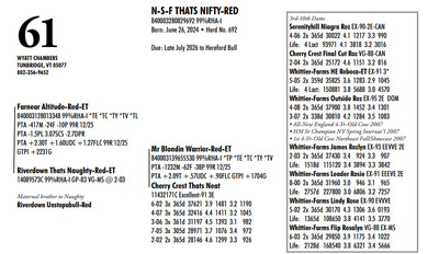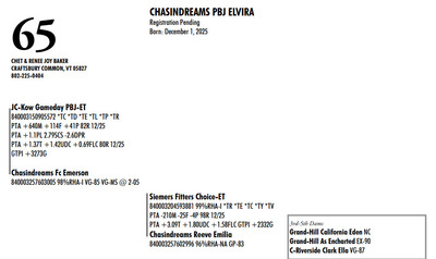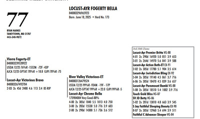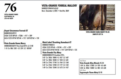 DVC GREEN & GOLD SPRING SPECTACULAR 108 Farm View Road, Doylestown PA, 18901 21st Anniversary Edition Contact Agent: Aaron Ray Tompkins 336-363-4639 Catalog | Terms of Auction Download CATALOG Download SALE ORDER Download UPDATES Download UPDATED LOTS Download UPDATED LOTS Catalog | Terms Download CATALOG Download SALE ORDER Download UPDATES Download UPDATED LOTS Download UPDATED LOTS All Items (95) Cattle (84) Embryos (11) Categories All Items (95) Cattle (84) Embryos (11) Search Item #: Keyword: Search Catalog Item #: Keyword: 20 items per page 50 items per page 100 items per page Go to page #: 1 , 2 , 3 , 4 , 5 #60 – MIDDLEBUSH ALT DARLENE-RED 840003298976978 99%RHA-I *TC *TL 43K GTPI +1989G +2.15T +1.30UDC +1.79FLC A1/A2 BB Location: 108 Farm View Road, Doylestown PA, 18901 Contact Agent: Aaron Ray Tompkins 336-363-4639 More Info / Bid Now Track this Item Sold High Bid: $2,600.00 – #118 #60 – MIDDLEBUSH ALT DARLENE-RED Sold High Bid: $2,600 More Details More Info / Bid Track Item 840003298976978 99%RHA-I *TC *TL 43K GTPI +1989G +2.15T +1.30UDC +1.79FLC A1/A2 BB Location: 108 Farm View Road, Doylestown PA, 18901 Contact Agent: Aaron Ray Tompkins 336-363-4639 #61 – N-S-F THATS NIFTY-RED 840003280829692 99%RHA-I Born: June 26, 2024 Herd No. 692 Due: Late July 2026 to Hereford Bull Location: 108 Farm View Road, Doylestown PA, 18901 Contact Agent: Aaron Ray Tompkins 336-363-4639 More Info / Bid Now Track this Item Sold High Bid: $2,100.00 – #1060 #61 – N-S-F THATS NIFTY-RED Sold High Bid: $2,100 More Details More Info / Bid Track Item 840003280829692 99%RHA-I Born: June 26, 2024 Herd No. 692 Due: Late July 2026 to Hereford Bull Location: 108 Farm View Road, Doylestown PA, 18901 Contact Agent: Aaron Ray Tompkins 336-363-4639 #62 – DERRWYN MCLOVIN MASCARA-RED 840003288543248 Born: June 3, 2025 Location: 108 Farm View Road, Doylestown PA, 18901 Contact Agent: Aaron Ray Tompkins 336-363-4639 More Info / Bid Now Track this Item Sold High Bid: $2,100.00 – #118 #62 – DERRWYN MCLOVIN MASCARA-RED Sold High Bid: $2,100 More Details More Info / Bid Track Item 840003288543248 Born: June 3, 2025 Location: 108 Farm View Road, Doylestown PA, 18901 Contact Agent: Aaron Ray Tompkins 336-363-4639 #63 – S-PINE-LAWN HANANS LETASHA 840003306497508 99%RHA-I Born: July 19, 2025 Herd No. 1502 Location: 108 Farm View Road, Doylestown PA, 18901 Contact Agent: Aaron Ray Tompkins 336-363-4639 More Info / Bid Now Track this Item Sold High Bid: $2,200.00 – #118 #63 – S-PINE-LAWN HANANS LETASHA Sold High Bid: $2,200 More Details More Info / Bid Track Item 840003306497508 99%RHA-I Born: July 19, 2025 Herd No. 1502 Location: 108 Farm View Road, Doylestown PA, 18901 Contact Agent: Aaron Ray Tompkins 336-363-4639 #64 – PENN-BREEZE PEVE DOTTIE 840003305028153 99%RHA-I Born: July 6, 2025 Herd No. 107 Location: 108 Farm View Road, Doylestown PA, 18901 Contact Agent: Aaron Ray Tompkins 336-363-4639 More Info / Bid Now Track this Item Sold High Bid: $2,750.00 – #136 #64 – PENN-BREEZE PEVE DOTTIE Sold High Bid: $2,750 More Details More Info / Bid Track Item 840003305028153 99%RHA-I Born: July 6, 2025 Herd No. 107 Location: 108 Farm View Road, Doylestown PA, 18901 Contact Agent: Aaron Ray Tompkins 336-363-4639 #65 – CHASINDREAMS PBJ ELVIRA Registration Pending Born: December 1, 2025 Location: 108 Farm View Road, Doylestown PA, 18901 Contact Agent: Aaron Ray Tompkins 336-363-4639 More Info / Bid Now Track this Item Sold High Bid: $1,850.00 – #110 #65 – CHASINDREAMS PBJ ELVIRA Sold High Bid: $1,850 More Details More Info / Bid Track Item Registration Pending Born: December 1, 2025 Location: 108 Farm View Road, Doylestown PA, 18901 Contact Agent: Aaron Ray Tompkins 336-363-4639 #66 – DAN-LY AFTERSHOCK BARBIE 840003251620030 Good Plus-80 @ 2-05 Born: April 17, 2023 1-10 2x 268d 15090 3.7 562 2.8 428 Fresh: February 16, 2026 Location: 108 Farm View Road, Doylestown PA, 18901 Contact Agent: Aaron Ray Tompkins 336-363-4639 More Info / Bid Now Track this Item Sold High Bid: $2,850.00 – #104 #66 – DAN-LY AFTERSHOCK BARBIE Sold High Bid: $2,850 More Details More Info / Bid Track Item 840003251620030 Good Plus-80 @ 2-05 Born: April 17, 2023 1-10 2x 268d 15090 3.7 562 2.8 428 Fresh: February 16, 2026 Location: 108 Farm View Road, Doylestown PA, 18901 Contact Agent: Aaron Ray Tompkins 336-363-4639 #67 – HEIFER CALF Registration Pending Born: September 18, 2025 Location: 108 Farm View Road, Doylestown PA, 18901 Contact Agent: Aaron Ray Tompkins 336-363-4639 More Info / Bid Now Track this Item Sold High Bid: $2,600.00 – #1053 #67 – HEIFER CALF Sold High Bid: $2,600 More Details More Info / Bid Track Item Registration Pending Born: September 18, 2025 Location: 108 Farm View Road, Doylestown PA, 18901 Contact Agent: Aaron Ray Tompkins 336-363-4639 #68 – PLEASANT NOOK MANGO DAIQUIRI-ET 840003288247258 Born: March 1, 2024 Herd No. 31 Fresh: March 3, 2026 Location: 108 Farm View Road, Doylestown PA, 18901 Contact Agent: Aaron Ray Tompkins 336-363-4639 More Info / Bid Now Track this Item No Bids Starting at $1,000.00 Login to Bid #68 – PLEASANT NOOK MANGO DAIQUIRI-ET Starting at $1,000.00 Login to Bid More Details More Info / Bid Track Item 840003288247258 Born: March 1, 2024 Herd No. 31 Fresh: March 3, 2026 Location: 108 Farm View Road, Doylestown PA, 18901 Contact Agent: Aaron Ray Tompkins 336-363-4639 #69 – CANADIAN CLUB X RICH EMBRYOS FIVE-#1 IVF EMBRYOS Made with Sexed Semen Located at: Trans Ova, Madison, WI Location: 108 Farm View Road, Doylestown PA, 18901 Contact Agent: Aaron Ray Tompkins 336-363-4639 More Info / Bid Now Track this Item Sold High Bid: $225.00 – #1086 Auction Type: Quantity x Price Quantity: 5 #69 – CANADIAN CLUB X RICH EMBRYOS Quantity x PriceQuantity: 5 Sold High Bid: $225 More Details More Info / Bid Track Item FIVE-#1 IVF EMBRYOS Made with Sexed Semen Located at: Trans Ova, Madison, WI Location: 108 Farm View Road, Doylestown PA, 18901 Contact Agent: Aaron Ray Tomp