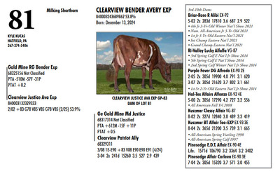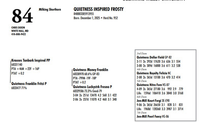 DVC GREEN & GOLD SPRING SPECTACULAR 108 Farm View Road, Doylestown PA, 18901 21st Anniversary Edition Contact Agent: Aaron Ray Tompkins 336-363-4639 Catalog | Terms of Auction Download CATALOG Download SALE ORDER Download UPDATES Download UPDATED LOTS Download UPDATED LOTS Catalog | Terms Download CATALOG Download SALE ORDER Download UPDATES Download UPDATED LOTS Download UPDATED LOTS All Items (95) Cattle (84) Embryos (11) Categories All Items (95) Cattle (84) Embryos (11) Search Item #: Keyword: Search Catalog Item #: Keyword: 20 items per page 50 items per page 100 items per page Go to page #: 1 , 2 , 3 , 4 , 5 #80 – CLEARVIEW JUSTICE AVON EXP ET 840003243659863 57.4% Born: March 26, 2025 Tattoo K27 Location: 108 Farm View Road, Doylestown PA, 18901 Contact Agent: Aaron Ray Tompkins 336-363-4639 More Info / Bid Now Track this Item Sold High Bid: $3,000.00 – #124 #80 – CLEARVIEW JUSTICE AVON EXP ET Sold High Bid: $3,000 More Details More Info / Bid Track Item 840003243659863 57.4% Born: March 26, 2025 Tattoo K27 Location: 108 Farm View Road, Doylestown PA, 18901 Contact Agent: Aaron Ray Tompkins 336-363-4639 #81 – CLEARVIEW BENDER AVERY EXP 840003243689862 53.8% Born: December 13, 2024 Location: 108 Farm View Road, Doylestown PA, 18901 Contact Agent: Aaron Ray Tompkins 336-363-4639 More Info / Bid Now Track this Item Sold High Bid: $1,800.00 – #118 #81 – CLEARVIEW BENDER AVERY EXP Sold High Bid: $1,800 More Details More Info / Bid Track Item 840003243689862 53.8% Born: December 13, 2024 Location: 108 Farm View Road, Doylestown PA, 18901 Contact Agent: Aaron Ray Tompkins 336-363-4639 #82 – OAK PRIDE C BANDIT 840003284988734 73.6% Born: June 1, 2024 Due: August 11, 2026 to Gold Mine Rg Bender Exp 614MS363 Location: 108 Farm View Road, Doylestown PA, 18901 Contact Agent: Aaron Ray Tompkins 336-363-4639 More Info / Bid Now Track this Item Sold High Bid: $2,000.00 – #124 #82 – OAK PRIDE C BANDIT Sold High Bid: $2,000 More Details More Info / Bid Track Item 840003284988734 73.6% Born: June 1, 2024 Due: August 11, 2026 to Gold Mine Rg Bender Exp 614MS363 Location: 108 Farm View Road, Doylestown PA, 18901 Contact Agent: Aaron Ray Tompkins 336-363-4639 #83 – HARD CORE SPIDERMAN DERBY 68333426 Born: June 14, 2025 Location: 108 Farm View Road, Doylestown PA, 18901 Contact Agent: Aaron Ray Tompkins 336-363-4639 More Info / Bid Now Track this Item Sold High Bid: $1,500.00 – #1060 #83 – HARD CORE SPIDERMAN DERBY Sold High Bid: $1,500 More Details More Info / Bid Track Item 68333426 Born: June 14, 2025 Location: 108 Farm View Road, Doylestown PA, 18901 Contact Agent: Aaron Ray Tompkins 336-363-4639 #84 – QUIETNESS INSPIRED FROSTY 840003305913955 Born: December 1, 2025 Herd No. 952 Location: 108 Farm View Road, Doylestown PA, 18901 Contact Agent: Aaron Ray Tompkins 336-363-4639 More Info / Bid Now Track this Item Sold High Bid: $1,200.00 – #102 #84 – QUIETNESS INSPIRED FROSTY Sold High Bid: $1,200 More Details More Info / Bid Track Item 840003305913955 Born: December 1, 2025 Herd No. 952 Location: 108 Farm View Road, Doylestown PA, 18901 Contact Agent: Aaron Ray Tompkins 336-363-4639 #85 – JACORIS PENNY STARLA 840003257602833 A1/A2 Born: February 26, 2023 Herd No. 3389 2-00 2x 311d 9845 3.9 385 3.4 311 Due: May 15, 2026 Rozelyn Theo Velman788GU21 and Trent-Way Rifle Location: 108 Farm View Road, Doylestown PA, 18901 Contact Agent: Aaron Ray Tompkins 336-363-4639 More Info / Bid Now Track this Item Sold High Bid: $2,800.00 – #1056 #85 – JACORIS PENNY STARLA Sold High Bid: $2,800 More Details More Info / Bid Track Item 840003257602833 A1/A2 Born: February 26, 2023 Herd No. 3389 2-00 2x 311d 9845 3.9 385 3.4 311 Due: May 15, 2026 Rozelyn Theo Velman788GU21 and Trent-Way Rifle Location: 108 Farm View Road, Doylestown PA, 18901 Contact Agent: Aaron Ray Tompkins 336-363-4639 #86 – MCAVOY LANE FREEDOM PATRIOT 97018845 A2A2 Born: May 30, 2024 Buy him, Pay, Then Pick up at Seller’s Farm by April 14, 2026 Location: 108 Farm View Road, Doylestown PA, 18901 Contact Agent: Aaron Ray Tompkins 336-363-4639 More Info / Bid Now Track this Item No Bids Starting at $1,000.00 Login to Bid #86 – MCAVOY LANE FREEDOM PATRIOT Starting at $1,000.00 Login to Bid More Details More Info / Bid Track Item 97018845 A2A2 Born: May 30, 2024 Buy him, Pay, Then Pick up at Seller’s Farm by April 14, 2026 Location: 108 Farm View Road, Doylestown PA, 18901 Contact Agent: Aaron Ray Tompkins 336-363-4639 #87 – TERRA-ROSE THUNDER FLICKA 840003256125866 99%RHA-I VG-86 Born: June 28, 2022 Herd No. 29 2-05 2x 332d 22230 3.6 799 3.1 682 Fresh: March 2, 2026 Location: 108 Farm View Road, Doylestown PA, 18901 Contact Agent: Aaron Ray Tompkins 336-363-4639 More Info / Bid Now Track this Item Sold High Bid: $5,600.00 – #131 #87 – TERRA-ROSE THUNDER FLICKA Sold High Bid: $5,600 More Details More Info / Bid Track Item 840003256125866 99%RHA-I VG-86 Born: June 28, 2022 Herd No. 29 2-05 2x 332d 22230 3.6 799 3.1 682 Fresh: March 2, 2026 Location: 108 Farm View Road, Doylestown PA, 18901 Contact Agent: Aaron Ray Tompkins 336-363-4639 #88 – REDCARPET DVORE CHECKERS-ET 840003300557201 99%RHA-I *RC Born: December 17, 2025 Herd No. 794 Location: 108 Farm View Road, Doylestown PA, 18901 Contact Agent: Aaron Ray Tompkins 336-363-4639 More Info / Bid Now Track this Item Sold High Bid: $2,500.00 – #112 #88 – REDCARPET DVORE CHECKERS-ET Sold High Bid: $2,500 More Details More Info / Bid Track Item 840003300557201 99%RHA-I *RC Born: December 17, 2025 Herd No. 794 Location: 108 Farm View Road, Doylestown PA, 18901 Contact Agent: Aaron Ray Tompkins 336-363-4639 #89 – OAKFIELD HULU FALCON-ET 840003300557182 99%RHA-I *RC Born: September 1, 2025 Herd 775 Location: 108 Farm View Road, Doylestown PA, 18901 Contact Agent: Aaron Ray Tompkins 336-363-4639 More Info / Bid Now Track this Item Sold High Bid: $4,550.00 – #159 #89 – OAKFIELD HULU FALCON-ET Sold High Bid: $4,550 More Details More Info / Bid Track Item 