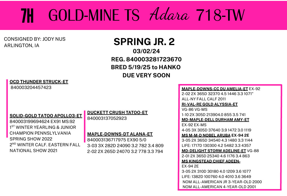 Spring Jr. 2 3/02/24 Reg#840003281723670 Due 3/20/26 serviced naturally to a red bull. Substitution Twin to heifer in catalog. Consigned by Jody Nus
