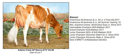 Selling choice of two (2) heifer calves due in March 2026 sired by Wipeout out of Adams Creek AP Bianca-ETV. Calves will be A2A2 by parentage. Terms: 35% down, remainder due at time of choice. Choice must be made by the time youngest calf is 90 days of age.