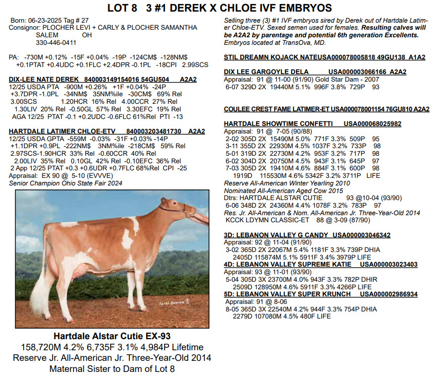 Selling three (3) #1 IVF embryos sired by Derek out of Hartdale Latimer Chloe-ETV. Sexed semen used for females. Resulting calves will
