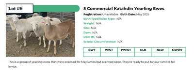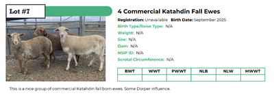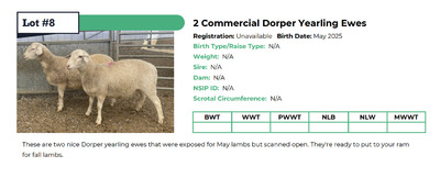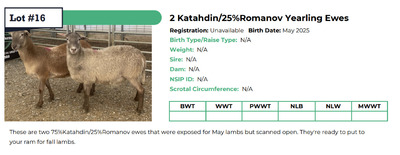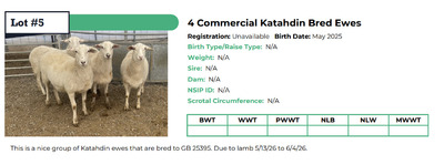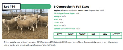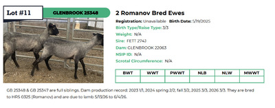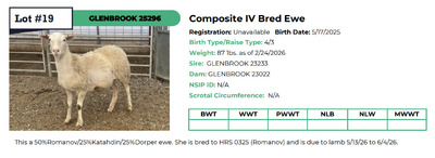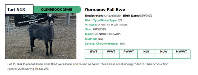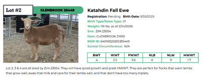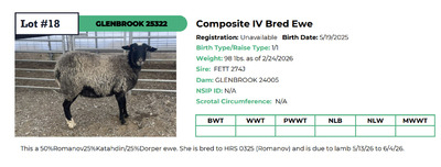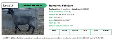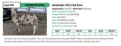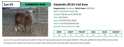Glenbrook Farm SHEEP AUCTION 114 Glenbrook Rd, Leola PA, 17540 130 Hd. Katahdin, Dorper, Romanov Sheep Contact Agent: Myles Branch 336-583-5725 Catalog | Terms of Auction Download CATALOG Catalog | Terms Download CATALOG All Items (55) No Category (55) Categories All Items (55) No Category (55) Search Item #: Keyword: Search Catalog Item #: Keyword: 20 items per page 50 items per page 100 items per page Go to page #: 1 , 2 , 3 #1 – Katahdin 75% SEX: Ewe CLASS: Fall EAR TAG: GLENBROOK 25458 WEIGHT: 94 SIRE: ELR 21400 DAM: GLENBROOK 23065 DESCIPTION: This ewe has good growth, great NLB, NLW and MWWT! We don't let many ewes of this caliber go, but we can't keep them all. DOB: 09/25/25 Location: 114 Glenbrook Rd, Leola PA, 17540 Contact Agent: Myles Branch 336-583-5725 More Info / Bid Now Track this Item Sold High Bid: $775.00 – #3 #1 – Katahdin 75% Sold High Bid: $775 More Details More Info / Bid Track Item SEX: Ewe CLASS: Fall EAR TAG: GLENBROOK 25458 WEIGHT: 94 SIRE: ELR 21400 DAM: GLENBROOK 23065 DESCIPTION: This ewe has good growth, great NLB, NLW and MWWT! We don't let many ewes of this caliber go, but we can't keep them all. DOB: 09/25/25 Location: 114 Glenbrook Rd, Leola PA, 17540 Contact Agent: Myles Branch 336-583-5725 #2 – Katahdin SEX: Ewe CLASS: Fall EAR TAG: GLENBROOK 25449 WEIGHT: 119 SIRE: ZIM 23054 DAM: GLENBROOK 21059 DESCIPTION: Lot 2, 3 & 4 are all sired by Zim 23054. They will have good growth and great MWWT. They are perfect for flocks that want lambs that grow well, ewes that milk and care for their lambs well, and that don't have too many triplets. DOB: 09/25/25 Location: 114 Glenbrook Rd, Leola PA, 17540 Contact Agent: Myles Branch 336-583-5725 More Info / Bid Now Track this Item Sold High Bid: $700.00 – #303 #2 – Katahdin Sold High Bid: $700 More Details More Info / Bid Track Item SEX: Ewe CLASS: Fall EAR TAG: GLENBROOK 25449 WEIGHT: 119 SIRE: ZIM 23054 DAM: GLENBROOK 21059 DESCIPTION: Lot 2, 3 & 4 are all sired by Zim 23054. They will have good growth and great MWWT. They are perfect for flocks that want lambs that grow well, ewes that milk and care for their lambs well, and that don't have too many triplets. DOB: 09/25/25 Location: 114 Glenbrook Rd, Leola PA, 17540 Contact Agent: Myles Branch 336-583-5725 #3 – Katahdin 87.5% SEX: Ewe CLASS: Fall EAR TAG: GLENBROOK 25461 WEIGHT: 98 SIRE: ZIM 23054 DAM: GLENBROOK 18023 DESCIPTION: Lot 2, 3 & 4 are all sired by Zim 23054. They will have good growth and great MWWT. They are perfect for flocks that want lambs the grow well, ewes that milk and care for their lambs well and that don't have too many triplets. DOB: 09/25/25 Location: 114 Glenbrook Rd, Leola PA, 17540 Contact Agent: Myles Branch 336-583-5725 More Info / Bid Now Track this Item Sold High Bid: $600.00 – #303 #3 – Katahdin 87.5% Sold High Bid: $600 More Details More Info / Bid Track Item SEX: Ewe CLASS: Fall EAR TAG: GLENBROOK 25461 WEIGHT: 98 SIRE: ZIM 23054 DAM: GLENBROOK 18023 DESCIPTION: Lot 2, 3 & 4 are all sired by Zim 23054. They will have good growth and great MWWT. They are perfect for flocks that want lambs the grow well, ewes that milk and care for their lambs well and that don't have too many triplets. DOB: 09/25/25 Location: 114 Glenbrook Rd, Leola PA, 17540 Contact Agent: Myles Branch 336-583-5725 #4 – Katahdin 75% SEX: Ewe CLASS: Fall EAR TAG: GLENBROOK 25481 WEIGHT: 105 SIRE: ZIM 23054 DAM: GLENBROOK 20334 DESCIPTION: Lot 2, 3 & 4 are all sired by Zim 23054. They will have good growth and great MWWT. They are perfect for flocks that want lambs the grow well, ewes that milk and care for their lambs well and don't have too many triplets. Full sibling to lot 41. DOB: 09/29/25 Location: 114 Glenbrook Rd, Leola PA, 17540 Contact Agent: Myles Branch 336-583-5725 More Info / Bid Now Track this Item Sold High Bid: $850.00 – #120 #4 – Katahdin 75% Sold High Bid: $850 More Details More Info / Bid Track Item SEX: Ewe CLASS: Fall EAR TAG: GLENBROOK 25481 WEIGHT: 105 SIRE: ZIM 23054 DAM: GLENBROOK 20334 DESCIPTION: Lot 2, 3 & 4 are all sired by Zim 23054. They will have good growth and great MWWT. They are perfect for flocks that want lambs the grow well, ewes that milk and care for their lambs well and don't have too many triplets. Full sibling to lot 41. DOB: 09/29/25 Location: 114 Glenbrook Rd, Leola PA, 17540 Contact Agent: Myles Branch 336-583-5725 #5 – 4 Commercial Katahdin SEX: Ewes CLASS: Bred DESCIPTION: This is a nice group of Katahdin ewes that are bred to GB 25395. Due to lamb 5/13/26 to 6/4/26. DOB: 05/01/25 Location: 114 Glenbrook Rd, Leola PA, 17540 Contact Agent: Myles Branch 336-583-5725 More Info / Bid Now Track this Item Sold High Bid: $575.00 – #139 Auction Type: Quantity x Price Quantity: 4 #5 – 4 Commercial Katahdin Quantity x PriceQuantity: 4 Sold High Bid: $575 More Details More Info / Bid Track Item SEX: Ewes CLASS: Bred DESCIPTION: This is a nice group of Katahdin ewes that are bred to GB 25395. Due to lamb 5/13/26 to 6/4/26. DOB: 05/01/25 Location: 114 Glenbrook Rd, Leola PA, 17540 Contact Agent: Myles Branch 336-583-5725 #6 – 5 Commercial Katahdin SEX: Ewes CLASS: Yearling DESCIPTION: This is a group of yearling ewes that were exposed for May lambs but scanned open. They're ready to put to your ram for fall lambs. DOB: 05/01/25 Location: 114 Glenbrook Rd, Leola PA, 17540 Contact Agent: Myles Branch 336-583-5725 More Info / Bid Now Track this Item Sold High Bid: $525.00 – #108 Auction Type: Quantity x Price Quantity: 5 #6 – 5 Commercial Katahdin Quantity x PriceQuantity: 5 Sold High Bid: $525 More Details More Info / Bid Track Item SEX: Ewes CLASS: Yearling DESCIPTION: This is a group of yearling ewes that were exposed for May lambs but scanned open. They're ready to put to your ram for fall lambs. DOB: 05/01/25 Location: 114 Glenbrook Rd, Leola PA, 17540 Contact Agent: Myles Branch 336-583-5725 #7 – 4 Commercial Katahdin SEX: Ewes CLASS: Fall DESCIPTION: This is a nice group of commercial Kat