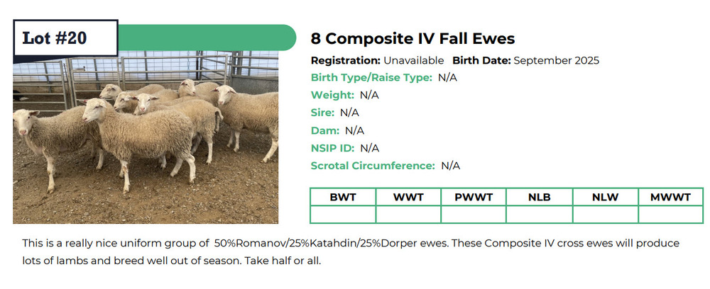DESCIPTION: This is a really nice uniform group of 50% Romanov/25% Katahdin/ 25% Dorper ewes. These Composite IV cross ewes will produce lots of lambs and breed well out of season. Take half or all.