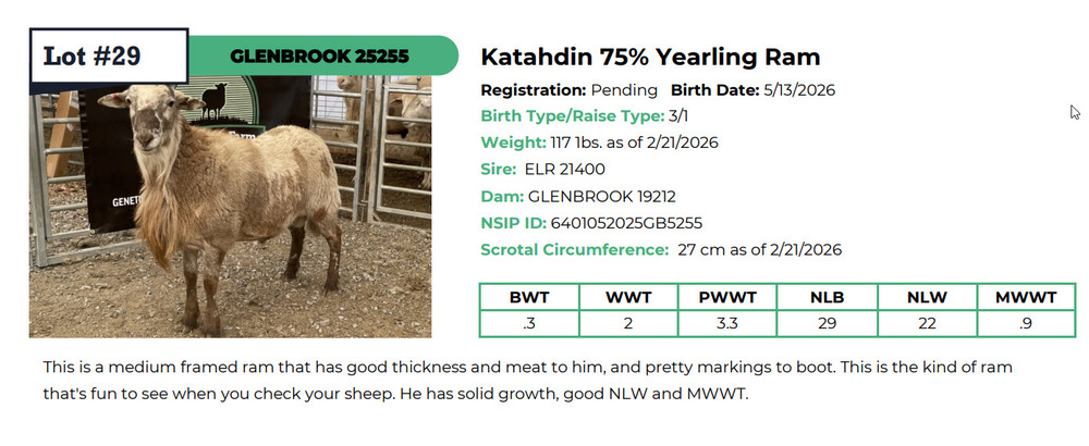 DESCIPTION: This is a medium framed ram that has good thickness and meat to him and a pretty marking to boot.This is the kind of ram that's fun to see when you check your sheep. He has solid growth, good NLW and MWWT.