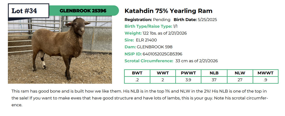 DESCIPTION: This ram has good bone and is built how we like them. His NLB is in the top 1% and NLW in the 2%! His NLB is one of the top in the sale! If you want to make ewes that have good structure and have lots of lambs, this is your guy. Note his scrotal circumference.