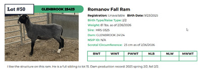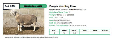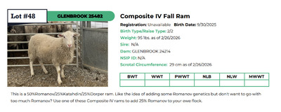 Glenbrook Farm SHEEP AUCTION 114 Glenbrook Rd, Leola PA, 17540 130 Hd. Katahdin, Dorper, Romanov Sheep Contact Agent: Myles Branch 336-583-5725 Catalog | Terms of Auction Download CATALOG Catalog | Terms Download CATALOG All Items (55) No Category (55) Categories All Items (55) No Category (55) Search Item #: Keyword: Search Catalog Item #: Keyword: 20 items per page 50 items per page 100 items per page Go to page #: 1 , 2 , 3 #41 – Katahdin 75% SEX: Ram CLASS: Fall EAR TAG: GLENBROOK 25480 WEIGHT: 121 SIRE: ZIM 23054 DAM: GLENBROOK 20334 DESCIPTION: Full sibling to lot 4. He is a nice long straight ram who's MWWT is in the top 5%. DOB: 09/29/25 Location: 114 Glenbrook Rd, Leola PA, 17540 Contact Agent: Myles Branch 336-583-5725 More Info / Bid Now Track this Item Sold High Bid: $950.00 – #1015 #41 – Katahdin 75% Sold High Bid: $950 More Details More Info / Bid Track Item SEX: Ram CLASS: Fall EAR TAG: GLENBROOK 25480 WEIGHT: 121 SIRE: ZIM 23054 DAM: GLENBROOK 20334 DESCIPTION: Full sibling to lot 4. He is a nice long straight ram who's MWWT is in the top 5%. DOB: 09/29/25 Location: 114 Glenbrook Rd, Leola PA, 17540 Contact Agent: Myles Branch 336-583-5725 #42 – Commercial Katahdin SEX: Ram CLASS: Fall EAR TAG: GLENBROOK 25494 WEIGHT: 124 SIRE: ZIM 23054 DAM: GLENBROOK 24334 DESCIPTION: A nice meaty commercial Katahdin ram with a wide front end on him. DOB: 10/09/25 Location: 114 Glenbrook Rd, Leola PA, 17540 Contact Agent: Myles Branch 336-583-5725 More Info / Bid Now Track this Item Sold High Bid: $925.00 – #143 #42 – Commercial Katahdin Sold High Bid: $925 More Details More Info / Bid Track Item SEX: Ram CLASS: Fall EAR TAG: GLENBROOK 25494 WEIGHT: 124 SIRE: ZIM 23054 DAM: GLENBROOK 24334 DESCIPTION: A nice meaty commercial Katahdin ram with a wide front end on him. DOB: 10/09/25 Location: 114 Glenbrook Rd, Leola PA, 17540 Contact Agent: Myles Branch 336-583-5725 #43 – Dorper SEX: Ram CLASS: Yearling EAR TAG: GLENBROOK 25375 WEIGHT: 136 SIRE: LWD 22005 DAM: GLENBROOK 23044 DESCIPTION: A medium framed thick Dorper ram with a good front end on him. DOB: 05/22/25 Location: 114 Glenbrook Rd, Leola PA, 17540 Contact Agent: Myles Branch 336-583-5725 More Info / Bid Now Track this Item Sold High Bid: $650.00 – #126 #43 – Dorper Sold High Bid: $650 More Details More Info / Bid Track Item SEX: Ram CLASS: Yearling EAR TAG: GLENBROOK 25375 WEIGHT: 136 SIRE: LWD 22005 DAM: GLENBROOK 23044 DESCIPTION: A medium framed thick Dorper ram with a good front end on him. DOB: 05/22/25 Location: 114 Glenbrook Rd, Leola PA, 17540 Contact Agent: Myles Branch 336-583-5725 #44 – Dorper SEX: Ram CLASS: Fall EAR TAG: GLENBROOK 25475 WEIGHT: 111 SIRE: LWD 22005 DAM: GLENBROOK 22014 DESCIPTION: A nice long Dorper ram with a good hair coat. DOB: 09/29/25 Location: 114 Glenbrook Rd, Leola PA, 17540 Contact Agent: Myles Branch 336-583-5725 More Info / Bid Now Track this Item Sold High Bid: $800.00 – #78 #44 – Dorper Sold High Bid: $800 More Details More Info / Bid Track Item SEX: Ram CLASS: Fall EAR TAG: GLENBROOK 25475 WEIGHT: 111 SIRE: LWD 22005 DAM: GLENBROOK 22014 DESCIPTION: A nice long Dorper ram with a good hair coat. DOB: 09/29/25 Location: 114 Glenbrook Rd, Leola PA, 17540 Contact Agent: Myles Branch 336-583-5725 #45 – Katahdin/Dorper SEX: Ram CLASS: Fall EAR TAG: GLENBROOK 25469 WEIGHT: 132 SIRE: LWD 22005 DAM: GLENBROOK 24021 DESCIPTION: This is a meaty Katahdin/Dorper ram. Add some meat to your Katahdins or some size to your Dorpers. DOB: 09/27/25 Location: 114 Glenbrook Rd, Leola PA, 17540 Contact Agent: Myles Branch 336-583-5725 More Info / Bid Now Track this Item Sold High Bid: $600.00 – #134 #45 – Katahdin/Dorper Sold High Bid: $600 More Details More Info / Bid Track Item SEX: Ram CLASS: Fall EAR TAG: GLENBROOK 25469 WEIGHT: 132 SIRE: LWD 22005 DAM: GLENBROOK 24021 DESCIPTION: This is a meaty Katahdin/Dorper ram. Add some meat to your Katahdins or some size to your Dorpers. DOB: 09/27/25 Location: 114 Glenbrook Rd, Leola PA, 17540 Contact Agent: Myles Branch 336-583-5725 #46 – Katahdin/Dorper SEX: Ram CLASS: Fall EAR TAG: GLENBROOK 25472 WEIGHT: 142 SIRE: LWD 22005 DAM: GLENBROOK 23308 DESCIPTION: A thick meaty Katahdin/Dorper ram. Add some meat to your Katahdins or some size to your Dorpers. DOB: 09/27/25 Location: 114 Glenbrook Rd, Leola PA, 17540 Contact Agent: Myles Branch 336-583-5725 More Info / Bid Now Track this Item Sold High Bid: $600.00 – #148 #46 – Katahdin/Dorper Sold High Bid: $600 More Details More Info / Bid Track Item SEX: Ram CLASS: Fall EAR TAG: GLENBROOK 25472 WEIGHT: 142 SIRE: LWD 22005 DAM: GLENBROOK 23308 DESCIPTION: A thick meaty Katahdin/Dorper ram. Add some meat to your Katahdins or some size to your Dorpers. DOB: 09/27/25 Location: 114 Glenbrook Rd, Leola PA, 17540 Contact Agent: Myles Branch 336-583-5725 #47 – Composite IV SEX: Ram CLASS: Fall EAR TAG: GLENBROOK 25430 WEIGHT: 115 SIRE: GLENBROOK 23233 DAM: GLENBROOK 22072 DESCIPTION: This is a 50% Romanov/25% Katahdin/ 25% Dorper ram. Like the idea of adding some Romanov genetics but don't want to go with too much Romanov? Use one of these Composite IV rams to add 25% Romanov to your ewe flock. DOB: 09/23/25 Location: 114 Glenbrook Rd, Leola PA, 17540 Contact Agent: Myles Branch 336-583-5725 More Info / Bid Now Track this Item Sold High Bid: $625.00 – #122 #47 – Composite IV Sold High Bid: $625 More Details More Info / Bid Track Item SEX: Ram CLASS: Fall EAR TAG: GLENBROOK 25430 WEIGHT: 115 SIRE: GLENBROOK 23233 DAM: GLENBROOK 22072 DESCIPTION: This is a 50% Romanov/25% Katahdin/ 25% Dorper ram. Like the idea of adding some Romanov genetics but don't want to go with too much Romanov? Use one of these Composite IV rams to add 25% Romanov to your ewe flock. DOB: 09/23/25 Location: 114 Glenbrook Rd, Leola PA, 17540 Contact Agent: Myles Branch 336-583-5725 #48 – Composite IV SEX: Ram CLASS: Fall EAR TAG: GLENBROOK 25482 WEIGHT: 95 SIRE: DAM: GLENBROOK 24214 DESCIPTION: This is a 50% Ro