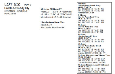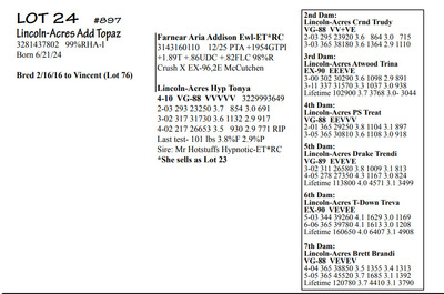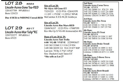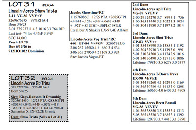 Lincoln Acres Dispersal 9411 Lucey Lane, Lancaster WI, 53813 Elite Holstein offering Contact Agent: Aaron Ray 336-363-4639 Catalog | Terms of Auction Download CATALOG Download UPDATES Download LOT 33 UPDATED Download LOT 106 Download SALE ORDER ISSUU CATALOG LINK Catalog | Terms Download CATALOG Download UPDATES Download LOT 33 UPDATED Download LOT 106 Download SALE ORDER ISSUU CATALOG LINK All Items (112) Cattle (112) Categories All Items (112) Cattle (112) Search Item #: Keyword: Search Catalog Item #: Keyword: 20 items per page 50 items per page 100 items per page Go to page #: 1 , 2 , 3 , 4 , 5 , 6 #20 – Lincoln-Acres Crush Tracy 5-05 VG-88 VVEVV 3216626574 99%RHA-I Born 9/10/20 2-04 291 22940 3.9 905 3.1 716 3-04 365 28910 3.6 1042 3.2 933 4-07 276 27380 3.5 958 3.3 876 RIP Last test- 78 lbs 3.4%F 3.5%P SCC 725,000 Fresh 5/3/25 Due 9/22/26 to 94HO19826 Showtime*RC Location: 9411 Lucey Lane, Lancaster WI, 53813 Contact Agent: Aaron Ray 336-363-4639 More Info / Bid Now Track this Item Sold High Bid: $2,400.00 – #500 #20 – Lincoln-Acres Crush Tracy Sold High Bid: $2,400 More Details More Info / Bid Track Item 5-05 VG-88 VVEVV 3216626574 99%RHA-I Born 9/10/20 2-04 291 22940 3.9 905 3.1 716 3-04 365 28910 3.6 1042 3.2 933 4-07 276 27380 3.5 958 3.3 876 RIP Last test- 78 lbs 3.4%F 3.5%P SCC 725,000 Fresh 5/3/25 Due 9/22/26 to 94HO19826 Showtime*RC Location: 9411 Lucey Lane, Lancaster WI, 53813 Contact Agent: Aaron Ray 336-363-4639 #21 – Lincoln-Acres Show Terri 3281437791 99%RHA-I Born 1/12/24 Due 2/11/26 to Vincint (Lot 76) Location: 9411 Lucey Lane, Lancaster WI, 53813 Contact Agent: Aaron Ray 336-363-4639 More Info / Bid Now Track this Item Sold High Bid: $3,050.00 – #500 #21 – Lincoln-Acres Show Terri Sold High Bid: $3,050 More Details More Info / Bid Track Item 3281437791 99%RHA-I Born 1/12/24 Due 2/11/26 to Vincint (Lot 76) Location: 9411 Lucey Lane, Lancaster WI, 53813 Contact Agent: Aaron Ray 336-363-4639 #22 – Lincoln-Acres Allg Tilly 3295722276 99%RHA-I Born 3/26/25 Location: 9411 Lucey Lane, Lancaster WI, 53813 Contact Agent: Aaron Ray 336-363-4639 More Info / Bid Now Track this Item Sold High Bid: $2,050.00 – #500 #22 – Lincoln-Acres Allg Tilly Sold High Bid: $2,050 More Details More Info / Bid Track Item 3295722276 99%RHA-I Born 3/26/25 Location: 9411 Lucey Lane, Lancaster WI, 53813 Contact Agent: Aaron Ray 336-363-4639 #23 – Lincoln-Acres Hyp Tonya 4-10 VG-88 VVVVV 3229993649 99%RHA-I Born 4/5/21 2-03 293 23250 3.7 854 3.0 691 3-02 317 31730 3.6 1132 2.9 917 4-02 217 26653 3.5 930 2.9 771 RIP Last test- 101 lbs 3.8%F 2.9%P SCC 84,000 Fresh 7/1/25 Due 8/11/26 to 94HO18820 Addison*RC Location: 9411 Lucey Lane, Lancaster WI, 53813 Contact Agent: Aaron Ray 336-363-4639 More Info / Bid Now Track this Item Sold High Bid: $3,000.00 – #500 #23 – Lincoln-Acres Hyp Tonya Sold High Bid: $3,000 More Details More Info / Bid Track Item 4-10 VG-88 VVVVV 3229993649 99%RHA-I Born 4/5/21 2-03 293 23250 3.7 854 3.0 691 3-02 317 31730 3.6 1132 2.9 917 4-02 217 26653 3.5 930 2.9 771 RIP Last test- 101 lbs 3.8%F 2.9%P SCC 84,000 Fresh 7/1/25 Due 8/11/26 to 94HO18820 Addison*RC Location: 9411 Lucey Lane, Lancaster WI, 53813 Contact Agent: Aaron Ray 336-363-4639 #24 – Lincoln-Acres Add Topaz 3281437802 99%RHA-I Born 6/21/24 Bred 2/16/16 to Vincent (Lot 76) Location: 9411 Lucey Lane, Lancaster WI, 53813 Contact Agent: Aaron Ray 336-363-4639 More Info / Bid Now Track this Item Sold High Bid: $2,000.00 – #500 #24 – Lincoln-Acres Add Topaz Sold High Bid: $2,000 More Details More Info / Bid Track Item 3281437802 99%RHA-I Born 6/21/24 Bred 2/16/16 to Vincent (Lot 76) Location: 9411 Lucey Lane, Lancaster WI, 53813 Contact Agent: Aaron Ray 336-363-4639 #25 – Lincoln-Acres Fe Trust 2-05 VG-85 VVV+V 3281437783 99%RHA-I Born 9/20/23 2-02 60 4494 3.4 156 2.8 124 RIP Last test- 85 lbs 3.1%F 2.8%P SCC 33,000 Fresh 12/5/25 Bred 2/26/26 to 788HO001 Cut Right-RED (sexed) Location: 9411 Lucey Lane, Lancaster WI, 53813 Contact Agent: Aaron Ray 336-363-4639 More Info / Bid Now Track this Item Sold High Bid: $3,600.00 – #500 #25 – Lincoln-Acres Fe Trust Sold High Bid: $3,600 More Details More Info / Bid Track Item 2-05 VG-85 VVV+V 3281437783 99%RHA-I Born 9/20/23 2-02 60 4494 3.4 156 2.8 124 RIP Last test- 85 lbs 3.1%F 2.8%P SCC 33,000 Fresh 12/5/25 Bred 2/26/26 to 788HO001 Cut Right-RED (sexed) Location: 9411 Lucey Lane, Lancaster WI, 53813 Contact Agent: Aaron Ray 336-363-4639 #26 – Lincoln-Acres Twyla RC*RC 3313090150 99%RHA-I Born 12/5/25 Location: 9411 Lucey Lane, Lancaster WI, 53813 Contact Agent: Aaron Ray 336-363-4639 More Info / Bid Now Track this Item Sold High Bid: $1,350.00 – #500 #26 – Lincoln-Acres Twyla RC*RC Sold High Bid: $1,350 More Details More Info / Bid Track Item 3313090150 99%RHA-I Born 12/5/25 Location: 9411 Lucey Lane, Lancaster WI, 53813 Contact Agent: Aaron Ray 336-363-4639 #27 – Lincoln-Acres Tatt Trella 4-00 VG-88 VVEVE 3229993657 99%RHA-I Born 7/5/21 2-05 365 33360 3.3 1116 2.9 954 3-09 300 30359 3.0 914 2.9 877 RIP Last test- 78 lbs 3.7%F 3.0%P SCC 135,000 Fresh 8/3/25 Due 1/30/26 to 94HO14105 Aftershock Location: 9411 Lucey Lane, Lancaster WI, 53813 Contact Agent: Aaron Ray 336-363-4639 More Info / Bid Now Track this Item Sold High Bid: $2,350.00 – #500 #27 – Lincoln-Acres Tatt Trella Sold High Bid: $2,350 More Details More Info / Bid Track Item 4-00 VG-88 VVEVE 3229993657 99%RHA-I Born 7/5/21 2-05 365 33360 3.3 1116 2.9 954 3-09 300 30359 3.0 914 2.9 877 RIP Last test- 78 lbs 3.7%F 3.0%P SCC 135,000 Fresh 8/3/25 Due 1/30/26 to 94HO14105 Aftershock Location: 9411 Lucey Lane, Lancaster WI, 53813 Contact Agent: Aaron Ray 336-363-4639 #28 – Lincoln-Acres Gone Tea-RED 3281437789 99%RHA-I Born 12/8/23 Due 4/18/26 to 94HO942 Unreal-RED Location: 9411 Lucey Lane, Lancaster WI, 53813 Contact Agent: Aaron Ray 336-363-4639 More Info / Bid Now Track this Item Sold High Bid: $4,350.00 – #500 #28 – Lincoln-Acres Gone Tea-RED Sold High Bid: $4,350 