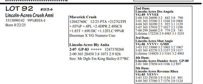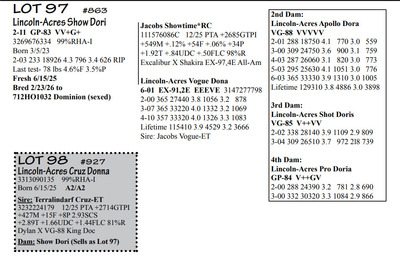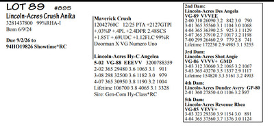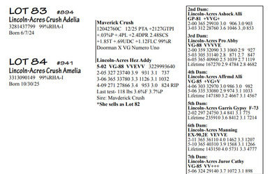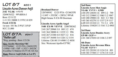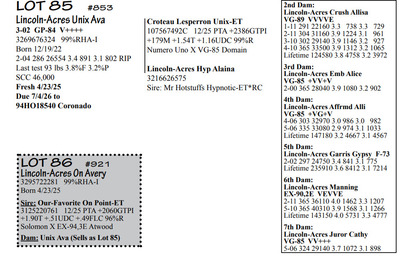 Lincoln Acres Dispersal 9411 Lucey Lane, Lancaster WI, 53813 Elite Holstein offering Contact Agent: Aaron Ray 336-363-4639 Catalog | Terms of Auction Download CATALOG Download UPDATES Download LOT 33 UPDATED Download LOT 106 Download SALE ORDER ISSUU CATALOG LINK Catalog | Terms Download CATALOG Download UPDATES Download LOT 33 UPDATED Download LOT 106 Download SALE ORDER ISSUU CATALOG LINK All Items (112) Cattle (112) Categories All Items (112) Cattle (112) Search Item #: Keyword: Search Catalog Item #: Keyword: 20 items per page 50 items per page 100 items per page Go to page #: 1 , 2 , 3 , 4 , 5 , 6 #80 – Lincoln-Acres Denver Frida 5-06 VG-86 VVV+V 3207178724 99%RHA-I Born 1/20/20 2-03 365 32380 4.4 1438 3.2 1027 3-07 365 41720 3.7 1553 3.1 1286 4-11 305 41630 2.9 1216 2.8 1147 LTD 126310 3.7 4696 3.0 3812 *Will sell fresh, Due 3/3/26 to 94HO21303 Lizzo Location: 9411 Lucey Lane, Lancaster WI, 53813 Contact Agent: Aaron Ray 336-363-4639 More Info / Bid Now Track this Item Sold High Bid: $2,850.00 – #1037 #80 – Lincoln-Acres Denver Frida Sold High Bid: $2,850 More Details More Info / Bid Track Item 5-06 VG-86 VVV+V 3207178724 99%RHA-I Born 1/20/20 2-03 365 32380 4.4 1438 3.2 1027 3-07 365 41720 3.7 1553 3.1 1286 4-11 305 41630 2.9 1216 2.8 1147 LTD 126310 3.7 4696 3.0 3812 *Will sell fresh, Due 3/3/26 to 94HO21303 Lizzo Location: 9411 Lucey Lane, Lancaster WI, 53813 Contact Agent: Aaron Ray 336-363-4639 #81 – Lincoln-Acres Alle Ella 3269676344 99%RHA-I Born 7/23/23 Due 4/18/26 to 94HO19826 Showtime*RC Location: 9411 Lucey Lane, Lancaster WI, 53813 Contact Agent: Aaron Ray 336-363-4639 More Info / Bid Now Track this Item Sold High Bid: $3,800.00 – #500 #81 – Lincoln-Acres Alle Ella Sold High Bid: $3,800 More Details More Info / Bid Track Item 3269676344 99%RHA-I Born 7/23/23 Due 4/18/26 to 94HO19826 Showtime*RC Location: 9411 Lucey Lane, Lancaster WI, 53813 Contact Agent: Aaron Ray 336-363-4639 #82 – Lincoln-Acres Hez Addy 5-02 VG-88 VVEVV 3229993640 99%RHA-NA Born 12/1/20 2-05 327 23740 3.9 931 3.1 737 3-06 365 33780 3.3 1126 3.1 1032 4-09 271 27866 3.4 953 3.0 824 RIP Last test- 118 lbs 3.6%F 3.7%P SCC 118,000 Fresh 5/8/25 Due 2/26/26 to 94HO18518 Denver (sexed) Location: 9411 Lucey Lane, Lancaster WI, 53813 Contact Agent: Aaron Ray 336-363-4639 More Info / Bid Now Track this Item Sold High Bid: $2,600.00 – #500 #82 – Lincoln-Acres Hez Addy Sold High Bid: $2,600 More Details More Info / Bid Track Item 5-02 VG-88 VVEVV 3229993640 99%RHA-NA Born 12/1/20 2-05 327 23740 3.9 931 3.1 737 3-06 365 33780 3.3 1126 3.1 1032 4-09 271 27866 3.4 953 3.0 824 RIP Last test- 118 lbs 3.6%F 3.7%P SCC 118,000 Fresh 5/8/25 Due 2/26/26 to 94HO18518 Denver (sexed) Location: 9411 Lucey Lane, Lancaster WI, 53813 Contact Agent: Aaron Ray 336-363-4639 #83 – Lincoln-Acres Crush Adelia 3281437799 99%RHA-I Born 6/7/24 Location: 9411 Lucey Lane, Lancaster WI, 53813 Contact Agent: Aaron Ray 336-363-4639 More Info / Bid Now Track this Item Sold High Bid: $2,000.00 – #500 #83 – Lincoln-Acres Crush Adelia Sold High Bid: $2,000 More Details More Info / Bid Track Item 3281437799 99%RHA-I Born 6/7/24 Location: 9411 Lucey Lane, Lancaster WI, 53813 Contact Agent: Aaron Ray 336-363-4639 #84 – Lincoln-Acres Crush Amelia 3313090149 99%RHA-I Born 10/30/25 Location: 9411 Lucey Lane, Lancaster WI, 53813 Contact Agent: Aaron Ray 336-363-4639 More Info / Bid Now Track this Item Sold High Bid: $950.00 – #500 #84 – Lincoln-Acres Crush Amelia Sold High Bid: $950 More Details More Info / Bid Track Item 3313090149 99%RHA-I Born 10/30/25 Location: 9411 Lucey Lane, Lancaster WI, 53813 Contact Agent: Aaron Ray 336-363-4639 #85 – Lincoln-Acres Unix Ava 3-02 GP-84 V++++ 3269676324 99%RHA-I Born 12/19/22 2-04 286 26554 3.4 891 3.1 802 RIP Last test 93 lbs 3.8%F 3.2%P SCC 46,000 Fresh 4/23/25 Due 7/4/26 to 94HO18540 Coronado Location: 9411 Lucey Lane, Lancaster WI, 53813 Contact Agent: Aaron Ray 336-363-4639 More Info / Bid Now Track this Item Sold High Bid: $2,850.00 – #500 #85 – Lincoln-Acres Unix Ava Sold High Bid: $2,850 More Details More Info / Bid Track Item 3-02 GP-84 V++++ 3269676324 99%RHA-I Born 12/19/22 2-04 286 26554 3.4 891 3.1 802 RIP Last test 93 lbs 3.8%F 3.2%P SCC 46,000 Fresh 4/23/25 Due 7/4/26 to 94HO18540 Coronado Location: 9411 Lucey Lane, Lancaster WI, 53813 Contact Agent: Aaron Ray 336-363-4639 #86 – Lincoln-Acres On Avery 3295722281 99%RHA-I Born 4/23/25 Location: 9411 Lucey Lane, Lancaster WI, 53813 Contact Agent: Aaron Ray 336-363-4639 More Info / Bid Now Track this Item Sold High Bid: $1,400.00 – #500 #86 – Lincoln-Acres On Avery Sold High Bid: $1,400 More Details More Info / Bid Track Item 3295722281 99%RHA-I Born 4/23/25 Location: 9411 Lucey Lane, Lancaster WI, 53813 Contact Agent: Aaron Ray 336-363-4639 #87 – Lincoln-Acres Denver Anjil 3-02 VG-86 ++V+V 3269676322 99%RHA-I Born 12/11/22 1-11 351 28000 3.5 970 3.0 839 Fresh 1/21/26 1st test- 101 lbs 3.9%F 3.8%P SCC 21,000 Location: 9411 Lucey Lane, Lancaster WI, 53813 Contact Agent: Aaron Ray 336-363-4639 More Info / Bid Now Track this Item Sold High Bid: $3,900.00 – #500 #87 – Lincoln-Acres Denver Anjil Sold High Bid: $3,900 More Details More Info / Bid Track Item 3-02 VG-86 ++V+V 3269676322 99%RHA-I Born 12/11/22 1-11 351 28000 3.5 970 3.0 839 Fresh 1/21/26 1st test- 101 lbs 3.9%F 3.8%P SCC 21,000 Location: 9411 Lucey Lane, Lancaster WI, 53813 Contact Agent: Aaron Ray 336-363-4639 #87A – HEIFER CALF *Reg. pending - Born 1/21/26 Location: 9411 Lucey Lane, Lancaster WI, 53813 Contact Agent: Aaron Ray 336-363-4639 More Info / Bid Now Track this Item Sold High Bid: $1,100.00 – #500 #87A – HEIFER CALF Sold High Bid: $1,100 More Details More Info / Bid Track Item *Reg. pending - Born 1/21/26 Location: 9411 Lucey Lane, Lancaster WI, 53813 Contact Agent: Aaron Ray 336-363-4639 #88 – Lincoln-Acres Art Andrea 2-02 GP-82 +GG+ 3281437788 99%RHA-I Born 12/2/23 2-00 35 1881 4.3 94 3.4 66 RIP Last test- 66 lbs 4.5%F 3.2%P 
