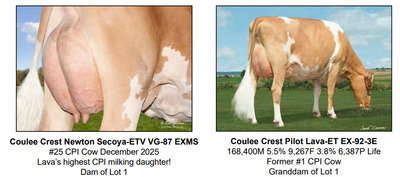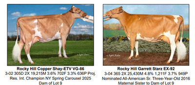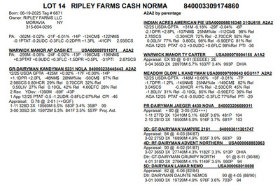 2026 NYS Guernsey Video Sale 6301 NY-298, East Syracuse NY, 13057 AWESOME GUERNSEY OFFERING Contact Agent: Zach Johnson 802-222-1422 Catalog | Terms of Auction Download CATALOG Download CORRECTED LOT 2 Download SALE ORDER Catalog | Terms Download CATALOG Download CORRECTED LOT 2 Download SALE ORDER All Items (15) Cattle (11) Embryos (4) Categories All Items (15) Cattle (11) Embryos (4) Search Item #: Keyword: Search Catalog Item #: Keyword: 20 items per page 50 items per page 100 items per page Go to page #: 1 #1 – LEGACY X SECOYA IVF EMBRYOS Selling four (4) #1 IVF embryos sired by Legacy out of Coulee Crest Newton Secoya-ETV. Sexed semen was used for females. Resulting calves will be A2A2 by parentage and would rank in the top 150 CPI Heifers - December 2025. Embryos located at Vytelle. Location: 6301 NY-298, East Syracuse NY, 13057 Contact Agent: Zach Johnson 802-222-1422 More Info / Bid Now Track this Item Sold High Bid: $575.00 – #1021 Auction Type: Quantity x Price Quantity: 4 #1 – LEGACY X SECOYA IVF EMBRYOS Quantity x PriceQuantity: 4 Sold High Bid: $575 More Details More Info / Bid Track Item Selling four (4) #1 IVF embryos sired by Legacy out of Coulee Crest Newton Secoya-ETV. Sexed semen was used for females. Resulting calves will be A2A2 by parentage and would rank in the top 150 CPI Heifers - December 2025. Embryos located at Vytelle. Location: 6301 NY-298, East Syracuse NY, 13057 Contact Agent: Zach Johnson 802-222-1422 #2 – PRESCOTT X SUNSET IVF EMBRYOS Selling three (3) #1 IVF embryos sired by PRESCOTT out of Misty Meadows HP GG Sunset-ETV. Sexed semen was used for females. Resulting calves will be A2A2 by parentage. Embryos located at TransOva, MD. Location: 6301 NY-298, East Syracuse NY, 13057 Contact Agent: Zach Johnson 802-222-1422 More Info / Bid Now Track this Item Sold High Bid: $575.00 – #1028 Auction Type: Quantity x Price Quantity: 3 #2 – PRESCOTT X SUNSET IVF EMBRYOS Quantity x PriceQuantity: 3 Sold High Bid: $575 More Details More Info / Bid Track Item Selling three (3) #1 IVF embryos sired by PRESCOTT out of Misty Meadows HP GG Sunset-ETV. Sexed semen was used for females. Resulting calves will be A2A2 by parentage. Embryos located at TransOva, MD. Location: 6301 NY-298, East Syracuse NY, 13057 Contact Agent: Zach Johnson 802-222-1422 #3 – TORPEDO X LEIA IVF EMBRYOS Selling three (3) #1 IVF embryos sired by Torpedo out of Golden I Jonathan Leia. Sexed semen used for females. Resulting calves will be A2A2 by parentage. Embryos located at White Oak Veterinary Clinic, Berlin, PA. Location: 6301 NY-298, East Syracuse NY, 13057 Contact Agent: Zach Johnson 802-222-1422 More Info / Bid Now Track this Item Sold High Bid: $475.00 – #500 Auction Type: Quantity x Price Quantity: 3 #3 – TORPEDO X LEIA IVF EMBRYOS Quantity x PriceQuantity: 3 Sold High Bid: $475 More Details More Info / Bid Track Item Selling three (3) #1 IVF embryos sired by Torpedo out of Golden I Jonathan Leia. Sexed semen used for females. Resulting calves will be A2A2 by parentage. Embryos located at White Oak Veterinary Clinic, Berlin, PA. Location: 6301 NY-298, East Syracuse NY, 13057 Contact Agent: Zach Johnson 802-222-1422 #4 – JAMES DEAN X MYRTLE IVF EMBRYOS Selling three (3) #1 IVF embryos by James Dean out of Femara Myrtle. Sexed semen used for females. Resulting calves will be A2A2 by parentage. Embryos located at TransOva, MD. Location: 6301 NY-298, East Syracuse NY, 13057 Contact Agent: Zach Johnson 802-222-1422 More Info / Bid Now Track this Item Sold High Bid: $460.00 – #500 Auction Type: Quantity x Price Quantity: 3 #4 – JAMES DEAN X MYRTLE IVF EMBRYOS Quantity x PriceQuantity: 3 Sold High Bid: $460 More Details More Info / Bid Track Item Selling three (3) #1 IVF embryos by James Dean out of Femara Myrtle. Sexed semen used for females. Resulting calves will be A2A2 by parentage. Embryos located at TransOva, MD. Location: 6301 NY-298, East Syracuse NY, 13057 Contact Agent: Zach Johnson 802-222-1422 #5 – WARWICK MANOR MATCHMAKER PAT Born: 09-24-2025 Breeder & Owner: STOLTZFUS KOLBY EAST EARL PA 717-989-0521 PA: -204M -0.02% -13F +0.01% -6P -127CM$ -128NM$ +1.0PTAT +0.8UDC +0.7FLC -1.5DPR +0.6PL -10CPI 3.01SCS A2A2 by extended parentage Location: 6301 NY-298, East Syracuse NY, 13057 Contact Agent: Zach Johnson 802-222-1422 More Info / Bid Now Track this Item Sold High Bid: $2,600.00 – #500 #5 – WARWICK MANOR MATCHMAKER PAT Sold High Bid: $2,600 More Details More Info / Bid Track Item Born: 09-24-2025 Breeder & Owner: STOLTZFUS KOLBY EAST EARL PA 717-989-0521 PA: -204M -0.02% -13F +0.01% -6P -127CM$ -128NM$ +1.0PTAT +0.8UDC +0.7FLC -1.5DPR +0.6PL -10CPI 3.01SCS A2A2 by extended parentage Location: 6301 NY-298, East Syracuse NY, 13057 Contact Agent: Zach Johnson 802-222-1422 #6 – PLEASANT KNOB JD TRUFFLES-ET Born: 09-23-2025 Tag # 165 Breeder & Owner: RYMPH ANDREW JADEN GREENWICH NY 518-692-2012 PA: +28M +0.04% +7F +0.04% +8P -6CM$ -16NM$ +0.9PTAT +1.0UDC +0.8FLC -2.3DPR -0.1PL +21CPI 3.01SCS A2A2 by parentage Location: 6301 NY-298, East Syracuse NY, 13057 Contact Agent: Zach Johnson 802-222-1422 More Info / Bid Now Track this Item Sold High Bid: $2,200.00 – #1016 #6 – PLEASANT KNOB JD TRUFFLES-ET Sold High Bid: $2,200 More Details More Info / Bid Track Item Born: 09-23-2025 Tag # 165 Breeder & Owner: RYMPH ANDREW JADEN GREENWICH NY 518-692-2012 PA: +28M +0.04% +7F +0.04% +8P -6CM$ -16NM$ +0.9PTAT +1.0UDC +0.8FLC -2.3DPR -0.1PL +21CPI 3.01SCS A2A2 by parentage Location: 6301 NY-298, East Syracuse NY, 13057 Contact Agent: Zach Johnson 802-222-1422 #7 – PLEASANT KNOB J DANIELS TAMARA-ET-P Born: 03-02-2025 Tag # 12 Naturally Polled Kappa Casein AA See Lot 6 above for complete pedigree Location: 6301 NY-298, East Syracuse NY, 13057 Contact Agent: Zach Johnson 802-222-1422 More Info / Bid Now Track this Item Sold High Bid: $2,300.00 – #1036 #7 – PLEASANT KNOB J DANIELS TAMARA-ET-P Sold High Bid: $2,300 More Details More Info / Bid Track Item Born: 03-02-202