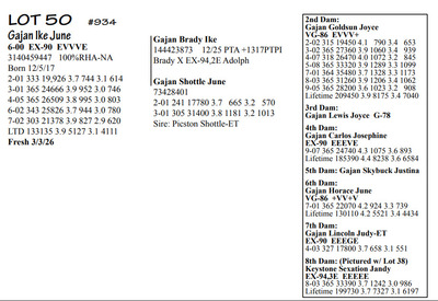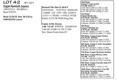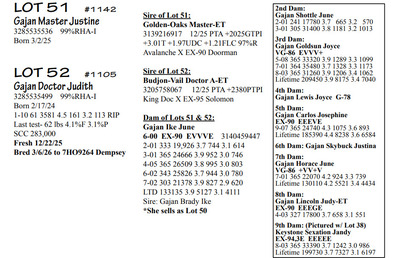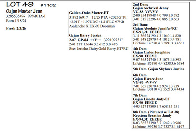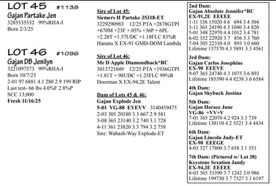 GAJAN HOLSTEINS DISPERSAL 1917 N. Churchtown RD, East Earl PA, 17519 Dairy Dispersal Auction Contact Agent: Katie 717-543-7883 Catalog | Terms of Auction Download CATALOG Download SALE ORDER Download UPDATES ISSUU CATALOG LINK Catalog | Terms Download CATALOG Download SALE ORDER Download UPDATES ISSUU CATALOG LINK All Items (130) Cattle (130) Categories All Items (130) Cattle (130) Search Item #: Keyword: Search Catalog Item #: Keyword: 20 items per page 50 items per page 100 items per page Go to page #: 1 , 2 , 3 , 4 , 5 , 6 #41 – Gajan DB Josephine 3285535500 99%RHA-I Born 2/25/24 Bred 8/29/25, Due 6/4/26 to 7HO17162 Haliant-P Location: 1917 N. Churchtown RD, East Earl PA, 17519 Contact Agent: Katie 717-543-7883 More Info / Bid Now Track this Item Sold High Bid: $3,800.00 – #32 #41 – Gajan DB Josephine Sold High Bid: $3,800 More Details More Info / Bid Track Item 3285535500 99%RHA-I Born 2/25/24 Bred 8/29/25, Due 6/4/26 to 7HO17162 Haliant-P Location: 1917 N. Churchtown RD, East Earl PA, 17519 Contact Agent: Katie 717-543-7883 #42 – Gajan Hasitall Joyous 3285535515 99%RHA-I Born 9/29/24 Bred 12/26/25, Due 10/1/26 to 94HO22396 Laurel Location: 1917 N. Churchtown RD, East Earl PA, 17519 Contact Agent: Katie 717-543-7883 More Info / Bid Now Track this Item Sold High Bid: $3,100.00 – #38 #42 – Gajan Hasitall Joyous Sold High Bid: $3,100 More Details More Info / Bid Track Item 3285535515 99%RHA-I Born 9/29/24 Bred 12/26/25, Due 10/1/26 to 94HO22396 Laurel Location: 1917 N. Churchtown RD, East Earl PA, 17519 Contact Agent: Katie 717-543-7883 #43 – Gajan Unstoppable Jo *RC 3221097577 99%RHA-I Born 1/2/24 Fresh 2/25/26 Location: 1917 N. Churchtown RD, East Earl PA, 17519 Contact Agent: Katie 717-543-7883 More Info / Bid Now Track this Item Sold High Bid: $3,800.00 – #116 #43 – Gajan Unstoppable Jo *RC Sold High Bid: $3,800 More Details More Info / Bid Track Item 3221097577 99%RHA-I Born 1/2/24 Fresh 2/25/26 Location: 1917 N. Churchtown RD, East Earl PA, 17519 Contact Agent: Katie 717-543-7883 #44 – Gajan Partake Joey 3285535570 99%RHA-I Born 2/25/26 Location: 1917 N. Churchtown RD, East Earl PA, 17519 Contact Agent: Katie 717-543-7883 More Info / Bid Now Track this Item Sold High Bid: $1,175.00 – #96 #44 – Gajan Partake Joey Sold High Bid: $1,175 More Details More Info / Bid Track Item 3285535570 99%RHA-I Born 2/25/26 Location: 1917 N. Churchtown RD, East Earl PA, 17519 Contact Agent: Katie 717-543-7883 #45 – Gajan Partake Jen 3285535532 99%RHA-I Born 2/3/25 Location: 1917 N. Churchtown RD, East Earl PA, 17519 Contact Agent: Katie 717-543-7883 More Info / Bid Now Track this Item Sold High Bid: $2,450.00 – #66 #45 – Gajan Partake Jen Sold High Bid: $2,450 More Details More Info / Bid Track Item 3285535532 99%RHA-I Born 2/3/25 Location: 1917 N. Churchtown RD, East Earl PA, 17519 Contact Agent: Katie 717-543-7883 #46 – Gajan DB Jenilyn 3221097573 99%RHA-I Born 10/7/23 2-01 97 6881 4.1 280 2.9 199 RIP Last test- 66 lbs 4.0%F 2.8%P SCC 13,000 Fresh 11/16/25 Location: 1917 N. Churchtown RD, East Earl PA, 17519 Contact Agent: Katie 717-543-7883 More Info / Bid Now Track this Item Sold High Bid: $3,800.00 – #123 #46 – Gajan DB Jenilyn Sold High Bid: $3,800 More Details More Info / Bid Track Item 3221097573 99%RHA-I Born 10/7/23 2-01 97 6881 4.1 280 2.9 199 RIP Last test- 66 lbs 4.0%F 2.8%P SCC 13,000 Fresh 11/16/25 Location: 1917 N. Churchtown RD, East Earl PA, 17519 Contact Agent: Katie 717-543-7883 #47 – Gajan Winners Circle Jenifer 3285535551 99%RHA-I Born 9/8/25 Location: 1917 N. Churchtown RD, East Earl PA, 17519 Contact Agent: Katie 717-543-7883 More Info / Bid Now Track this Item Sold High Bid: $2,000.00 – #161 #47 – Gajan Winners Circle Jenifer Sold High Bid: $2,000 More Details More Info / Bid Track Item 3285535551 99%RHA-I Born 9/8/25 Location: 1917 N. Churchtown RD, East Earl PA, 17519 Contact Agent: Katie 717-543-7883 #48 – Gajan Has It All Jerry 3285535510 99%RHA-I Born 9/4/24 Bred 1/17/26, Due 10/23/26 to 94HO22396 Laurel Location: 1917 N. Churchtown RD, East Earl PA, 17519 Contact Agent: Katie 717-543-7883 More Info / Bid Now Track this Item Sold High Bid: $3,300.00 – #1022 #48 – Gajan Has It All Jerry Sold High Bid: $3,300 More Details More Info / Bid Track Item 3285535510 99%RHA-I Born 9/4/24 Bred 1/17/26, Due 10/23/26 to 94HO22396 Laurel Location: 1917 N. Churchtown RD, East Earl PA, 17519 Contact Agent: Katie 717-543-7883 #49 – Gajan Master Jean 3285535496 99%RHA-I Born 1/18/24 Fresh 2/3/26 Location: 1917 N. Churchtown RD, East Earl PA, 17519 Contact Agent: Katie 717-543-7883 More Info / Bid Now Track this Item Sold High Bid: $3,400.00 – #48 #49 – Gajan Master Jean Sold High Bid: $3,400 More Details More Info / Bid Track Item 3285535496 99%RHA-I Born 1/18/24 Fresh 2/3/26 Location: 1917 N. Churchtown RD, East Earl PA, 17519 Contact Agent: Katie 717-543-7883 #50 – Gajan Ike June 6-00 EX-90 EVVVE 3140459447 100%RHA-NA Born 12/5/17 2-01 333 19,926 3.7 744 3.1 614 3-01 365 24666 3.9 952 3.0 746 4-05 365 26509 3.8 995 3.0 803 6-02 343 25826 3.7 944 3.0 780 7-02 303 21378 3.9 827 2.9 620 LTD 133135 3.9 5127 3.1 4111 Fresh 3/3/26 Location: 1917 N. Churchtown RD, East Earl PA, 17519 Contact Agent: Katie 717-543-7883 More Info / Bid Now Track this Item No Bids Starting at $1,500.00 Login to Bid #50 – Gajan Ike June Starting at $1,500.00 Login to Bid More Details More Info / Bid Track Item 6-00 EX-90 EVVVE 3140459447 100%RHA-NA Born 12/5/17 2-01 333 19,926 3.7 744 3.1 614 3-01 365 24666 3.9 952 3.0 746 4-05 365 26509 3.8 995 3.0 803 6-02 343 25826 3.7 944 3.0 780 7-02 303 21378 3.9 827 2.9 620 LTD 133135 3.9 5127 3.1 4111 Fresh 3/3/26 Location: 1917 N. Churchtown RD, East Earl PA, 17519 Contact Agent: Katie 717-543-7883 #51 – Gajan Master Justine 3285535536 99%RHA-I Born 3/2/25 Location: 1917 N. Churchtown RD, East Earl PA, 17519 Contact Agent: Katie 717-543-7883 More Info / Bid Now Track this Item Sold High Bid: $2,300.00 – #66 #51