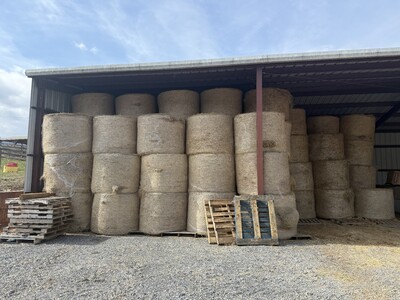 25 rolls of fescue/orchard grass mixed hay, 4x5 net wrapped rolls stored in the barn, harvested during 2024 growing season.