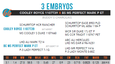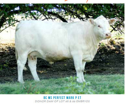 Selling 3-conventional embryos from mating of Cooley Royce 1107T39 x BC Ms Perfect Mark P ET. Royce sires great milking daughters with near perfect udder quality, moderate frame size, and volume. Perfect Mark has produced 32 calves and her dam, 7-1G, has produced 49 calves. 7-1G was the Champion Female at the Canadian Farm Show before selling to the States. The Ali Mark gives her great carcass and milking ability