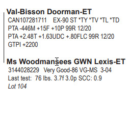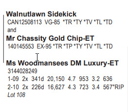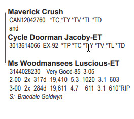 Woodmansee Top 100 Sale 319 Rt 165, Preston CT, 06365 Premier Holstein Offering Contact Agent: Chad Griffith 513-543-2315 Catalog | Terms of Auction Download CATALOG Download UPDATES Download SALE ORDER Download ADDED LOT Download ADDED LOT Catalog | Terms Download CATALOG Download UPDATES Download SALE ORDER Download ADDED LOT Download ADDED LOT All Items (148) Cattle (145) Embryos (3) Categories All Items (148) Cattle (145) Embryos (3) Search Item #: Keyword: Search Catalog Item #: Keyword: 20 items per page 50 items per page 100 items per page Go to page #: 3 , 4 , 5 , 6 , 7 , 8 #93 – WOODMANSEES UNSTP ARIENNA *RC 840003207027809 99%RHA-I *RC Born December 1, 2019 H.N. 458 Bred 2/03/21 to Citation R (ultrasound male) Location: 319 Rt 165, Preston CT, 06365 Contact Agent: Chad Griffith 513-543-2315 More Info / Bid Now Track this Item Sold High Bid: $1,650.00 – #386 #93 – WOODMANSEES UNSTP ARIENNA *RC Sold High Bid: $1,650 More Details More Info / Bid Track Item 840003207027809 99%RHA-I *RC Born December 1, 2019 H.N. 458 Bred 2/03/21 to Citation R (ultrasound male) Location: 319 Rt 165, Preston CT, 06365 Contact Agent: Chad Griffith 513-543-2315 #94 – WOODMANSEES DMPSY ARITA 840003127012229 Born July 16, 2020 H.N. 527 Location: 319 Rt 165, Preston CT, 06365 Contact Agent: Chad Griffith 513-543-2315 More Info / Bid Now Track this Item Sold High Bid: $1,900.00 – #390 #94 – WOODMANSEES DMPSY ARITA Sold High Bid: $1,900 More Details More Info / Bid Track Item 840003127012229 Born July 16, 2020 H.N. 527 Location: 319 Rt 165, Preston CT, 06365 Contact Agent: Chad Griffith 513-543-2315 #95 – MS LAURELS CRUSH LANA-ET 840003207552633 99%RHA-I *TR *TC *TL *TD Born June 2, 2019 H.N. 870 GPTA +2.48T +1.30UDC +.81FLC 79R 12/20 Due 7/15/21 to Croteau Lesperron Unix-ET 777HO3913 Location: 319 Rt 165, Preston CT, 06365 Contact Agent: Chad Griffith 513-543-2315 More Info / Bid Now Track this Item Sold High Bid: $3,500.00 – #419 #95 – MS LAURELS CRUSH LANA-ET Sold High Bid: $3,500 More Details More Info / Bid Track Item 840003207552633 99%RHA-I *TR *TC *TL *TD Born June 2, 2019 H.N. 870 GPTA +2.48T +1.30UDC +.81FLC 79R 12/20 Due 7/15/21 to Croteau Lesperron Unix-ET 777HO3913 Location: 319 Rt 165, Preston CT, 06365 Contact Agent: Chad Griffith 513-543-2315 #96 – WOODMANSEES DBACK MAXIE 840003151980903 99%RHA-I Born December 1, 2018 H.N. 365 2-03 2x 6d 248 4.4 11 3.6 9"RIP March test: 58 lbs. 4.6f 3.7p SCC 4.4 Fresh: March 3, 2021 Location: 319 Rt 165, Preston CT, 06365 Contact Agent: Chad Griffith 513-543-2315 More Info / Bid Now Track this Item Sold High Bid: $3,100.00 – #1060 #96 – WOODMANSEES DBACK MAXIE Sold High Bid: $3,100 More Details More Info / Bid Track Item 840003151980903 99%RHA-I Born December 1, 2018 H.N. 365 2-03 2x 6d 248 4.4 11 3.6 9"RIP March test: 58 lbs. 4.6f 3.7p SCC 4.4 Fresh: March 3, 2021 Location: 319 Rt 165, Preston CT, 06365 Contact Agent: Chad Griffith 513-543-2315 #97 – BORDERVIEW UNSTOPBL SNOW-ET *RC 840003220099763 99%RHA-I *RC *TC *TL *TD Born September 3, 2020 H.N. 1069 Location: 319 Rt 165, Preston CT, 06365 Contact Agent: Chad Griffith 513-543-2315 More Info / Bid Now Track this Item Sold High Bid: $2,200.00 – #412 #97 – BORDERVIEW UNSTOPBL SNOW-ET *RC Sold High Bid: $2,200 More Details More Info / Bid Track Item 840003220099763 99%RHA-I *RC *TC *TL *TD Born September 3, 2020 H.N. 1069 Location: 319 Rt 165, Preston CT, 06365 Contact Agent: Chad Griffith 513-543-2315 #98 – WOODMANSEES TSTORM TREVA-ET 840003207027811 99%RHA-I Born December 2, 2019 H.N. 460 Bred 3/14/21 to Peak Jagger-ET 734HO121 Location: 319 Rt 165, Preston CT, 06365 Contact Agent: Chad Griffith 513-543-2315 More Info / Bid Now Track this Item Sold High Bid: $7,400.00 – #370 #98 – WOODMANSEES TSTORM TREVA-ET Sold High Bid: $7,400 More Details More Info / Bid Track Item 840003207027811 99%RHA-I Born December 2, 2019 H.N. 460 Bred 3/14/21 to Peak Jagger-ET 734HO121 Location: 319 Rt 165, Preston CT, 06365 Contact Agent: Chad Griffith 513-543-2315 #99 – BUDJON-CRAVE AVAL SUNSET-ET 840003143525468 99%RHA-I Born March 3, 2019 H.N. Silver 33 GPTA +2.44T +1.94UDC +1.61FLC 79R 12/20 Fresh: March 8, 2021 Location: 319 Rt 165, Preston CT, 06365 Contact Agent: Chad Griffith 513-543-2315 More Info / Bid Now Track this Item No Bids Starting at $500.00 Login to Bid #99 – BUDJON-CRAVE AVAL SUNSET-ET Starting at $500.00 Login to Bid More Details More Info / Bid Track Item 840003143525468 99%RHA-I Born March 3, 2019 H.N. Silver 33 GPTA +2.44T +1.94UDC +1.61FLC 79R 12/20 Fresh: March 8, 2021 Location: 319 Rt 165, Preston CT, 06365 Contact Agent: Chad Griffith 513-543-2315 #99A – WOODMANSEES UNIX SILVER 3127012281 Born March 8, 2021 H.N. 579 Location: 319 Rt 165, Preston CT, 06365 Contact Agent: Chad Griffith 513-543-2315 More Info / Bid Now Track this Item No Bids Starting at $500.00 Login to Bid #99A – WOODMANSEES UNIX SILVER Starting at $500.00 Login to Bid More Details More Info / Bid Track Item 3127012281 Born March 8, 2021 H.N. 579 Location: 319 Rt 165, Preston CT, 06365 Contact Agent: Chad Griffith 513-543-2315 #100 – WOODMANSEES GOLDCHIP CONARY 840003201702824 99%RHA-I Born June 11, 2019 H.N. 1991 Bred 9/12/20 to Avant-Garde Unix Select-ET 7HO14920 Location: 319 Rt 165, Preston CT, 06365 Contact Agent: Chad Griffith 513-543-2315 More Info / Bid Now Track this Item Sold High Bid: $1,900.00 – #364 #100 – WOODMANSEES GOLDCHIP CONARY Sold High Bid: $1,900 More Details More Info / Bid Track Item 840003201702824 99%RHA-I Born June 11, 2019 H.N. 1991 Bred 9/12/20 to Avant-Garde Unix Select-ET 7HO14920 Location: 319 Rt 165, Preston CT, 06365 Contact Agent: Chad Griffith 513-543-2315 #101 – MS UNIX CALIFORNIA 840003210540586 99%RHA-I Born June 5, 2020 H.N. 2054 Location: 319 Rt 165, Preston CT, 06365 Contact Agent: Chad Griffith 513-543-2315 More Info / Bid Now Track this Item Sold High Bid: $1,400.00 – #1135 #101 – MS UNIX CALIFORNIA Sold High Bid: $1,400 More Details M