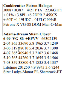 4-01 GP-82 ++VG+ 72363971 100%RHA-NA Born 3/3/13 2-04 365 27535 3.8 1045 3.3 918 3-07 272 24474 2.9 719 3.1 769 4-06 279 26775 3.2 866 3.2 864 5-06 282 27957 3.4 947 3.1 865 7-07 152 14529 4.2 605 3.1 454 RIP 4/1 test- 98 lbs 4.4%F 3.2%P SCC 1.2M Fresh 11/1/20
