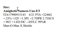 3-07 VG-85 G+++V 72364068 100%RHA-NA Born 11/2/14 2-05 310 22920 3.9 886 3.2 732 3-05 306 28464 3.0 849 3.2 902 4-06 311 27745 3.4 931 3.2 876 5-07 283 31474 3.5 1100 3.0 938 RIP April test- 78 lbs 4.3%F 3.6%P SCC 100,000 Fresh 6/23/20 Bred 9/21/20, Due 6/28/21 to 94HO19402 Airone