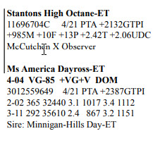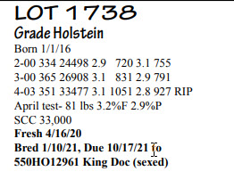 3-00 G-79 ++VF+ 72364176 99%RHA-I Born 1/14/16 4/21 PTA +2254GTPI 2-04 365 21853 4.3 948 3.4 746 3-10 322 28277 4.1 1163 3.2 912 5-00 50 5085 3.5 178 2.9 150 RIP April test- 108 lbs 3.2%F 2.8%P SCC 13,000 Fresh 2/11/21