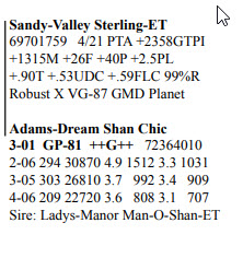 2-05 GP-81 ++F++ 3137018963 100%RHA-NA Born 8/2/16 2-00 364 26096 4.2 1088 3.2 832 3-06 323 31799 4.4 1409 3.1 993 4-07 14 1051 4.3 45 3.7 39 RIP April test- 94 lbs 3.9%F 3.3%P SCC 38,000 Fresh 3/19/21