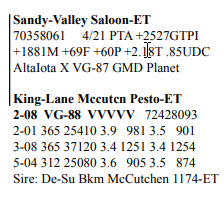 2-02 G-78 ++FFG 72364195 100%RHA-NA Born 4/22/16 1-10 365 27848 3.7 1023 2.9 805 3-03 343 27894 3.4 956 2.9 804 4-05 178 22377 3.5 785 2.7 609 RIP April test- 102 lbs 3.3%F 2.8%P SCC 132,000 Fresh 10/6/20 Bred 1/15/21, Due 10/22/21 to 200HO11822 Alleyoop