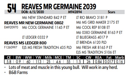 DOB: 6/5/2020 M942894 Scurs Lots of meat and muscle in this young bull. Will work in any herd.