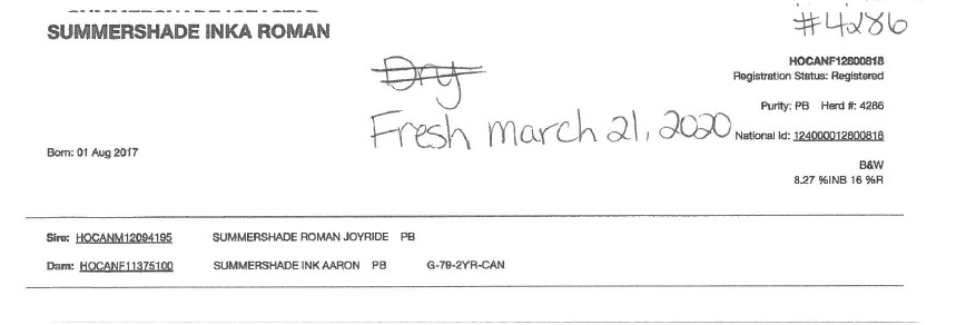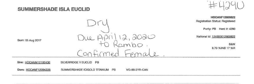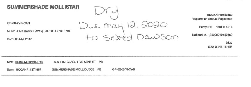 Lactation: 1 Satus: Dry Milk (kg) : SCC(thousand): 20 Sire: Dawson - SEXED Fresh Date: 01/00/00 Breeding: 08/06/19