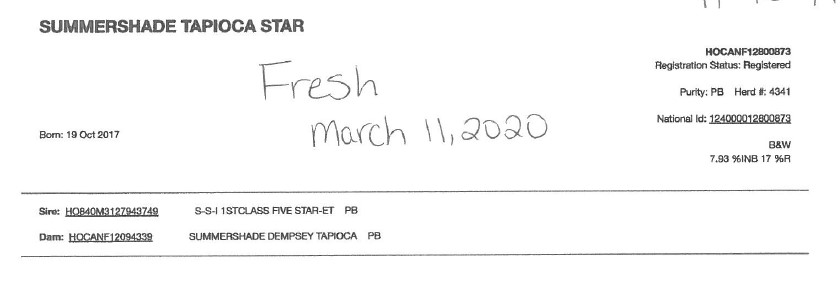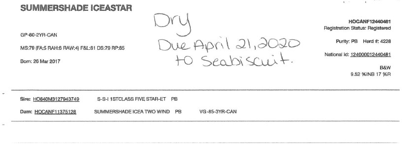 Lactation: 1 Satus: Dry Milk (kg) : SCC(thousand): 55 Sire: Seabiscuit Fresh Date: 01/00/00 Breeding: 07/16/19