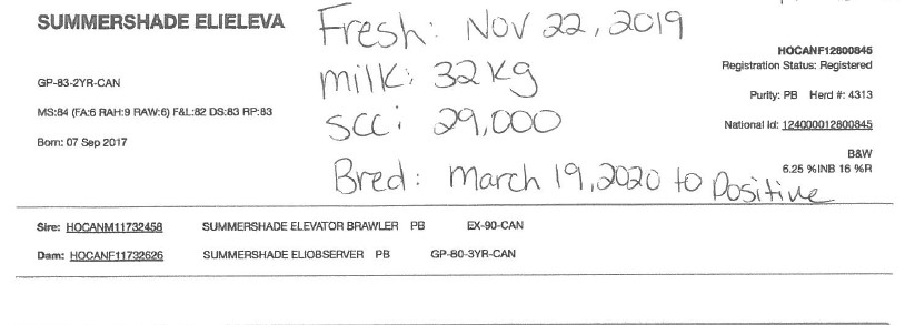 Lactation: 1 Satus: Milking Milk (kg) : 34.6 SCC(thousand): 20 Sire: Positive Fresh Date: 12/15/19 Breeding: 02/23/20