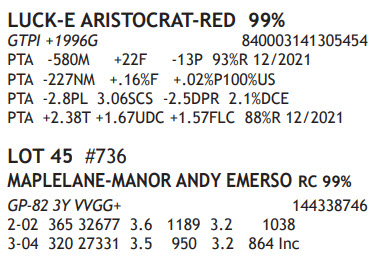 BORN 04/24/2019 Dau sells Lot 42 MILKING 86 LBS Fresh 5/14/21 GP-81 2Y ++GG+ 2-00 284 25366 4.2 1068 3.0 757 Inc BRED 10/15/21 TO MAPLELANE-MANOR BTLY MIDGE 144974061 BENTLEY-P-ET X EX-92 CLARK DAU