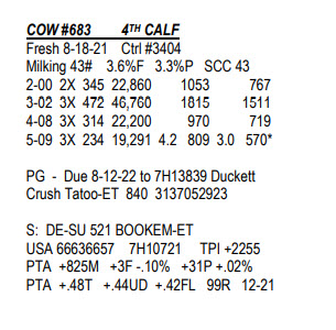 Fresh 8-18-21 Ctrl #3404 Milking 43# 3.6%F 3.3%P SCC 43 2-00 2X 345 22,860 1053 767 3-02 3X 472 46,760 1815 1511 4-08 3X 314 22,200 970 719 5-09 3X 234 19,291 4.2 809 3.0 570* PG - Due 8-12-22 to 7H13839 Duckett Crush Tatoo-ET 840 3137052923