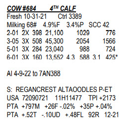 Fresh 12-21-20 Ctrl 3412 Milking 68# 3.9%F 3.4%P SCC 61 2-01 2X 387 27,250 1112 833 3-04 3X 509 46,010 1645 1338 5-02 3X 474 52,936 3.7 1945 2.8 1476* PG - Due 7-18-22 to 7AN388