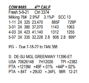Fresh 6-28-21 Ctrl 3449 Milking 88# 4.9%F 3.7%P SCC 37 2-01 2X 329 23,490 1156F 802P 3-02 3X 335 31,750 1277 963 4-03 3X 385 31,180 1389 1053 5-06 3X 285 25,617 4.3 1108 3.0 763* PG – Due 8-15-22 to 7H14838 Siemers Doc Hanford 840 3148093471