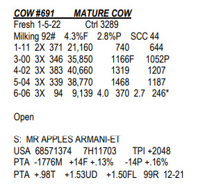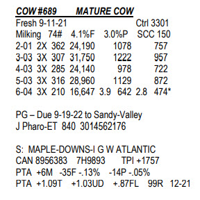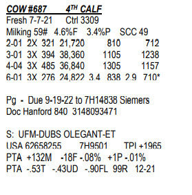 Fresh 10-9-21 Ctrl 2766 Milking 136# 3.3%F 3.2%P SCC 635 3-06 2X 318 34,620 1240F 1070P 4-06 3X 366 46,619 1524 1366 5-07 3X 159 19,598 3.6 699 3.2 628* PG - Due 10-17-21 to 250HO12975 Sandy-Valley J Pharo-ET 840 3014562176