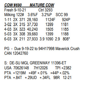 Fresh 9-10-21 Ctrl 3293 Milking 122# 3.6%F 3.2%P SCC 99 1-11 2X 371 28,160 1124F 924P 3-02 3X 315 37,730 1399 1181 4-03 3X 323 40,240 1505 1185 5-03 3X 308 39,660 1399 1188 6-03 3X 211 27,933 3.9 1090 2.9 808* PG - Due 9-19-22 to 94H17998 Maverick Crush CAN 12042760