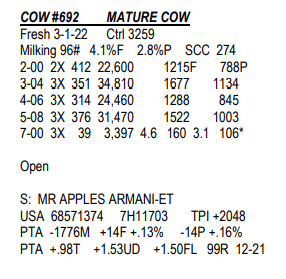 Fresh 2-12-21 Ctrl 3892 Milking 68# 3.9%F 3.3%P SCC 71 2-01 2X 332 24,630 996F 723P 3-02 3X 421 42,629 4.0 1691 3.0 1272* PG - Due 6-27-22 to 7H14838 Siemers Doc Hanford 840 3148093471