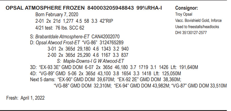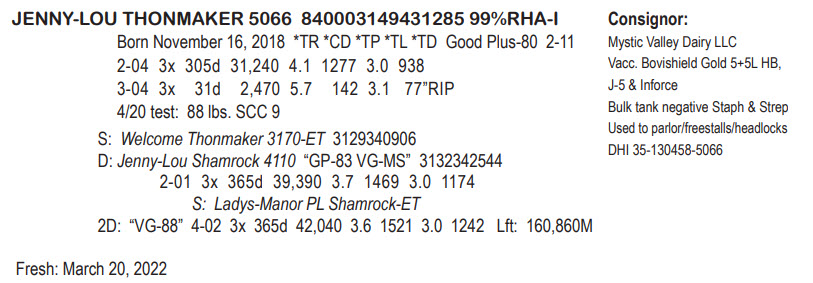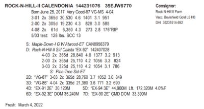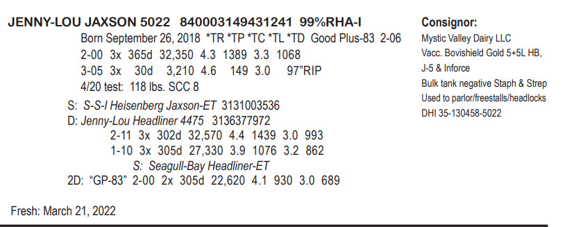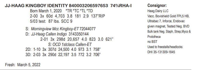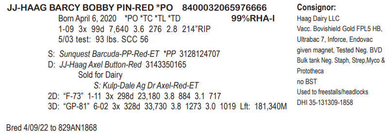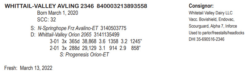 Great Northern's May Dairy Production Sale W4226 Hwy 23, Fond du Lac WI, 54937 Great offering of genetics... Contact Agent: Jordan : 920-946-8525 Catalog | Terms of Auction Download CATALOG Download SALE ORDER Catalog | Terms Download CATALOG Download SALE ORDER All Items (70) Cattle (70) Categories All Items (70) Cattle (70) Search Item #: Keyword: Search Catalog Item #: Keyword: 20 items per page 50 items per page 100 items per page Go to page #: 1 , 2 , 3 , 4 #21 – FARMDALE CRUSH BAILEY FARMDALE CRUSH BAILEY Location: W4226 Hwy 23, Fond du Lac WI, 54937 Contact Agent: Jordan : 920-946-8525 More Info / Bid Now Track this Item Sold High Bid: $2,500.00 – #500 #21 – FARMDALE CRUSH BAILEY Sold High Bid: $2,500 More Details More Info / Bid Track Item FARMDALE CRUSH BAILEY Location: W4226 Hwy 23, Fond du Lac WI, 54937 Contact Agent: Jordan : 920-946-8525 #22 – FARMDALE HANCOCK BELLA FARMDALE HANCOCK BELLA Location: W4226 Hwy 23, Fond du Lac WI, 54937 Contact Agent: Jordan : 920-946-8525 More Info / Bid Now Track this Item Sold High Bid: $2,900.00 – #500 #22 – FARMDALE HANCOCK BELLA Sold High Bid: $2,900 More Details More Info / Bid Track Item FARMDALE HANCOCK BELLA Location: W4226 Hwy 23, Fond du Lac WI, 54937 Contact Agent: Jordan : 920-946-8525 #23 – DREAMFIX C ENERGIZER BUNNY DREAMFIX C ENERGIZER BUNNY Location: W4226 Hwy 23, Fond du Lac WI, 54937 Contact Agent: Jordan : 920-946-8525 More Info / Bid Now Track this Item Sold High Bid: $1,650.00 – #500 #23 – DREAMFIX C ENERGIZER BUNNY Sold High Bid: $1,650 More Details More Info / Bid Track Item DREAMFIX C ENERGIZER BUNNY Location: W4226 Hwy 23, Fond du Lac WI, 54937 Contact Agent: Jordan : 920-946-8525 #23A – HEIFER CALF HEIFER CALF Location: W4226 Hwy 23, Fond du Lac WI, 54937 Contact Agent: Jordan : 920-946-8525 More Info / Bid Now Track this Item Sold High Bid: $350.00 – #1007 #23A – HEIFER CALF Sold High Bid: $350 More Details More Info / Bid Track Item HEIFER CALF Location: W4226 Hwy 23, Fond du Lac WI, 54937 Contact Agent: Jordan : 920-946-8525 #24 – SWITZER TALS DOBOY VELVET SWITZER TALS DOBOY VELVET Location: W4226 Hwy 23, Fond du Lac WI, 54937 Contact Agent: Jordan : 920-946-8525 More Info / Bid Now Track this Item Sold High Bid: $2,500.00 – #500 #24 – SWITZER TALS DOBOY VELVET Sold High Bid: $2,500 More Details More Info / Bid Track Item SWITZER TALS DOBOY VELVET Location: W4226 Hwy 23, Fond du Lac WI, 54937 Contact Agent: Jordan : 920-946-8525 #25 – JENNY-LOU JAXSON 5022 JENNY-LOU JAXSON 5022 Location: W4226 Hwy 23, Fond du Lac WI, 54937 Contact Agent: Jordan : 920-946-8525 More Info / Bid Now Track this Item Sold High Bid: $2,850.00 – #1015 #25 – JENNY-LOU JAXSON 5022 Sold High Bid: $2,850 More Details More Info / Bid Track Item JENNY-LOU JAXSON 5022 Location: W4226 Hwy 23, Fond du Lac WI, 54937 Contact Agent: Jordan : 920-946-8525 #26 – JENNY-LOU THONMAKER 5066 JENNY-LOU THONMAKER 5066 Location: W4226 Hwy 23, Fond du Lac WI, 54937 Contact Agent: Jordan : 920-946-8525 More Info / Bid Now Track this Item Sold High Bid: $2,900.00 – #500 #26 – JENNY-LOU THONMAKER 5066 Sold High Bid: $2,900 More Details More Info / Bid Track Item JENNY-LOU THONMAKER 5066 Location: W4226 Hwy 23, Fond du Lac WI, 54937 Contact Agent: Jordan : 920-946-8525 #27 – ROCK-N-HILL-II CALENDONIA ROCK-N-HILL-II CALENDONIA Location: W4226 Hwy 23, Fond du Lac WI, 54937 Contact Agent: Jordan : 920-946-8525 More Info / Bid Now Track this Item Sold High Bid: $2,500.00 – #500 #27 – ROCK-N-HILL-II CALENDONIA Sold High Bid: $2,500 More Details More Info / Bid Track Item ROCK-N-HILL-II CALENDONIA Location: W4226 Hwy 23, Fond du Lac WI, 54937 Contact Agent: Jordan : 920-946-8525 #28 – ROCK-N-HILL-II CALISSA ROCK-N-HILL-II CALISSA Location: W4226 Hwy 23, Fond du Lac WI, 54937 Contact Agent: Jordan : 920-946-8525 More Info / Bid Now Track this Item Sold High Bid: $2,000.00 – #500 #28 – ROCK-N-HILL-II CALISSA Sold High Bid: $2,000 More Details More Info / Bid Track Item ROCK-N-HILL-II CALISSA Location: W4226 Hwy 23, Fond du Lac WI, 54937 Contact Agent: Jordan : 920-946-8525 #29 – ROCK-N-HILL-II UNIX DARLENE ROCK-N-HILL-II UNIX DARLENE Location: W4226 Hwy 23, Fond du Lac WI, 54937 Contact Agent: Jordan : 920-946-8525 More Info / Bid Now Track this Item Sold High Bid: $2,150.00 – #500 #29 – ROCK-N-HILL-II UNIX DARLENE Sold High Bid: $2,150 More Details More Info / Bid Track Item ROCK-N-HILL-II UNIX DARLENE Location: W4226 Hwy 23, Fond du Lac WI, 54937 Contact Agent: Jordan : 920-946-8525 #30 – ROCK-N-HILL-II HERO SHABAM ROCK-N-HILL-II HERO SHABAM Location: W4226 Hwy 23, Fond du Lac WI, 54937 Contact Agent: Jordan : 920-946-8525 More Info / Bid Now Track this Item Sold High Bid: $2,300.00 – #500 #30 – ROCK-N-HILL-II HERO SHABAM Sold High Bid: $2,300 More Details More Info / Bid Track Item ROCK-N-HILL-II HERO SHABAM Location: W4226 Hwy 23, Fond du Lac WI, 54937 Contact Agent: Jordan : 920-946-8525 #31 – OPSAL SILVER SCAMPER-ET OPSAL SILVER SCAMPER-ET Location: W4226 Hwy 23, Fond du Lac WI, 54937 Contact Agent: Jordan : 920-946-8525 More Info / Bid Now Track this Item Sold High Bid: $1,800.00 – #500 #31 – OPSAL SILVER SCAMPER-ET Sold High Bid: $1,800 More Details More Info / Bid Track Item OPSAL SILVER SCAMPER-ET Location: W4226 Hwy 23, Fond du Lac WI, 54937 Contact Agent: Jordan : 920-946-8525 #32 – OPSAL ATMOSPHERE FROZEN OPSAL ATMOSPHERE FROZEN Location: W4226 Hwy 23, Fond du Lac WI, 54937 Contact Agent: Jordan : 920-946-8525 More Info / Bid Now Track this Item Sold High Bid: $1,900.00 – #500 #32 – OPSAL ATMOSPHERE FROZEN Sold High Bid: $1,900 More Details More Info / Bid Track Item OPSAL ATMOSPHERE FROZEN Location: W4226 Hwy 23, Fond du Lac WI, 54937 Contact Agent: Jordan : 920-946-8525 #33 – JJ-HAAG PHARO DELTA JJ-HAAG PHARO DELTA Location: W4226 Hwy 23, Fond du Lac WI, 54937 Contact Agent: Jordan : 920-946-8525 More Info / Bid Now Track this Item Sold High Bid: $2,550.00 – #500 #33 – JJ-HAA
