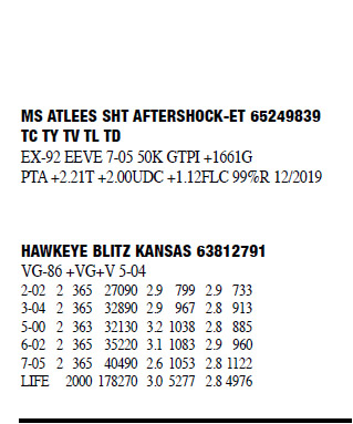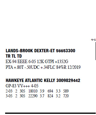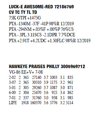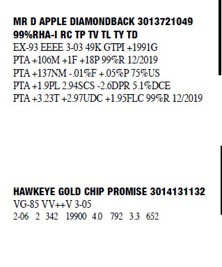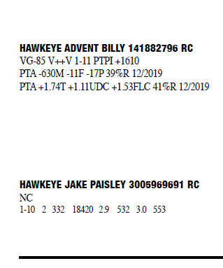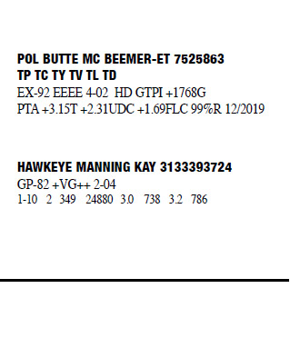 3014131148 100%RHA Born: September 12, 2014 Cali VG-87 VV+VV 4-08 2-01 2 309 19930 3.3 662 3.3 667 3-01 2 304 20730 3.3 687 3.4 699 4-01 2 365 38460 3.0 1166 3.2 1241 5-04 2 41 3619 3.1 112 3.2 114 (RIP) Sells Fresh 1/22/2020