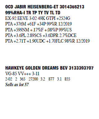 3014131139 100%RHA Born: June 19, 2014 Bridgit VG-87 EEVV+ 4-11 1-11 2 365 25520 3.1 780 2.9 740 3-02 2 322 23500 3.3 781 3.1 726 4-03 2 365 22210 3.2 713 3.1 683 5-07 2 18 1550 3.4 53 3.4 52 (RIP) Sells Fresh 2/14/2020