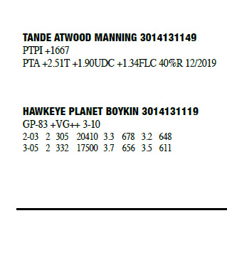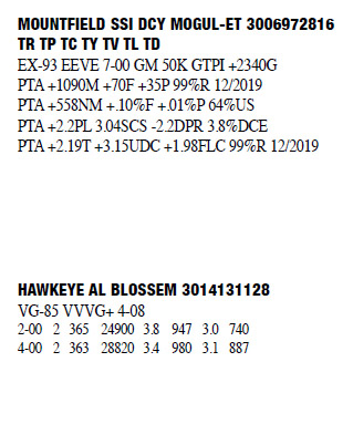 3133393717 100%RHA Born: February 17, 2016 Bliss VG-86 VEGVV 3-10 2-01 2 365 22560 4.0 909 3.2 720 3-07 2 143 13631 4.1 557 3.2 432 (RIP) Bred 12/24/2019 to Larcrest Kenosha 2515-ET 74630765 7H12773