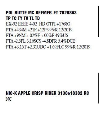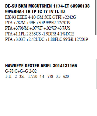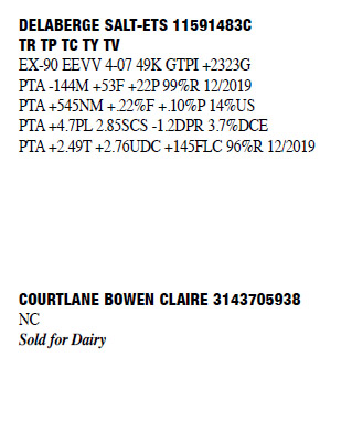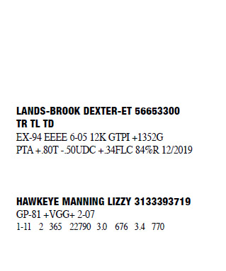 71309102 100%RHA Born: November 15, 2012 Casey EX-90 VEEEE 5-04 1-11 2 296 18230 4.0 736 3.0 548 2-10 2 365 22610 3.7 844 3.1 705 4-01 2 297 21690 3.4 732 2.9 620 5-00 2 365 28560 3.8 1076 3.1 872 6-06 2 292 23863 3.5 836 2.8 680 (RIP) Bred 3/20/2020 to Ri-Val-Re Rager-Red-ET 7235457 7HO12344