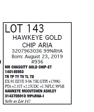 3143705904 99%RHA Born: June 1, 2017 Ashton GP-82 V+GV+ 2-06 1-11 2 307 17879 4.8 867 3.5 634 (RIP) Bred 9/23/2019 to Woodcrest King Doc 3132417775 250HO12961