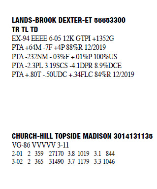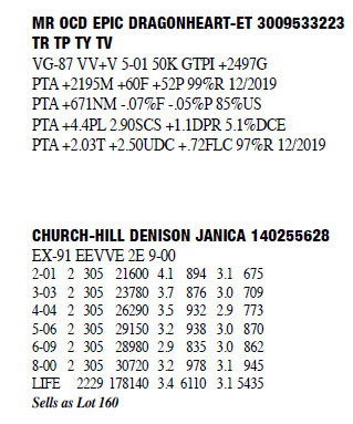 140255625 100%RHA Born: October 26, 2009 Janica EX-91 EEVVE 2E 9-00 2-01 2 365 23530 4.3 1004 3.2 744 3-03 2 335 24740 3.7 916 3.0 743 4-04 2 356 28650 3.6 1037 3.0 855 5-06 2 365 32240 3.2 1043 3.0 974 6-09 2 365 32140 2.9 934 3.0 962 8-00 2 365 33570 3.2 1065 3.1 1044 LIFE 2229 178140 3.4 6110 3.1 5435 9-07 2 272 27311 2.4 664 3.0 812 (RIP) Bred 2/20/2020 to S-S-I Montross Jedi-ET 3123886035 7HO13250