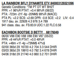 Born: 04/19/2018 Tattoo: P108 / P108 Consignor: RATKA, MEGAN & TYLER & ALLISON COLD SPRING MN 02/07 V86 V87 +80 V88 V87 V87 (12/20) PPR: +40 38%R PTAT: +0.3 42%R PTA: -187m +5f +1p +76NM$ 48%$ *02/03 365d 2X 21562 4.6 999 3.8 814 DHIA (calc) *03/08 158d 2X 12340 4.5 554 3.6 444 (RIP) CHAMPION BS, CENTRAL MN DAIRY DAYS 2022 Bred 4/12/2022 to: HF DESIGN ET 840003218804016 Genetic Conditions: PT DT MT WT BH2T PPR: +141 59%R PTAT: +0.9 64%R (08/22) PTA: +1019m +41f +37p +366NM$ 62%R (GEN) PTA PL: +0.1 SCS: +3.02 DPR: +0.5 SCE: LIV: -0.2