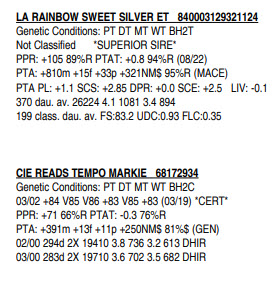 Born: 01/05/2019 Tattoo: R1299 Consignor: READ, ROGER & LORI & FAMILY LYLE MN Genetic Conditions: PT DT MT WT BH2T 02/06 V85 V85 +84 +84 V85 V85 (07/21) *CERT* PPR: +106 64%R PTAT: +0.5 74%R PTA: +896m +19f +28p +321NM$ 89%$ (GEN) 02/03 336d 2X 18150 4.2 754 3.2 589 DHIR Fresh test @46d 86m 3.4%f 2.8%p Genomics: PL+2.7 DPR +1.8 SCS +3.0 LIV +1.6 CM$ +343 UDC +.68 FLC +.77 Kappa Casein: A/B Beta Casein: A2/A2 Beta Lactoglobulin: A/B Bred 8/6/2022 to: PACTOLE 5356268551 Genetic Conditions: PT DT MT WT BH2T PPR: +210 58%R PTAT: +0.2 62%R (08/22) PTA: +1119m +51f +55p +601NM$ 60%R (GEN) PTA PL: +2.6 SCS: +2.78 DPR: +2.8 SCE: LIV: +0.1