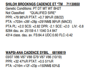 Born: 09/30/2020 Tattoo: F568 Consignor: FJELSTAD, MARK ZUMBRO FALLS MN Parent Average PPR: +36 PTAT: +0.4 PA: +31m +5f +2p +56NM$ Bred & Due 11/13/2022 to: TROUT HILLTOP JORDY ETV NP 840003215414562 Genetic Conditions: PC DT MT WT BH2T PPR: +116 63%R PTAT: +0.4 67%R (08/22) PTA: +566m +35f +32p +305NM$ 66%R (GEN) PTA PL: +1.2 SCS: +3.06 DPR: +0.1 SCE: +3.2 LIV: +0.4