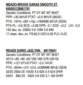 Born: 12/31/2019 Tattoo: 1432 Consignor: BLUE MOUNTAIN GENETICS ZUMBRO FALLS MN Parent Average PPR: +90 PTAT: +0.2 PA: +1059m +23f +33p +310NM$ Bred 7/18/2022 to: O MALLEY 4427424483 Genetic Conditions: PT DT MT WT BH2T PPR: +130 61%R PTAT: +0.5 63%R (08/22) PTA: +439m +28f +23p +339NM$ 65%R (GEN) PTA PL: +2.7 SCS: +3.02 DPR: +2.1 SCE: +2.3 LIV: +1.5